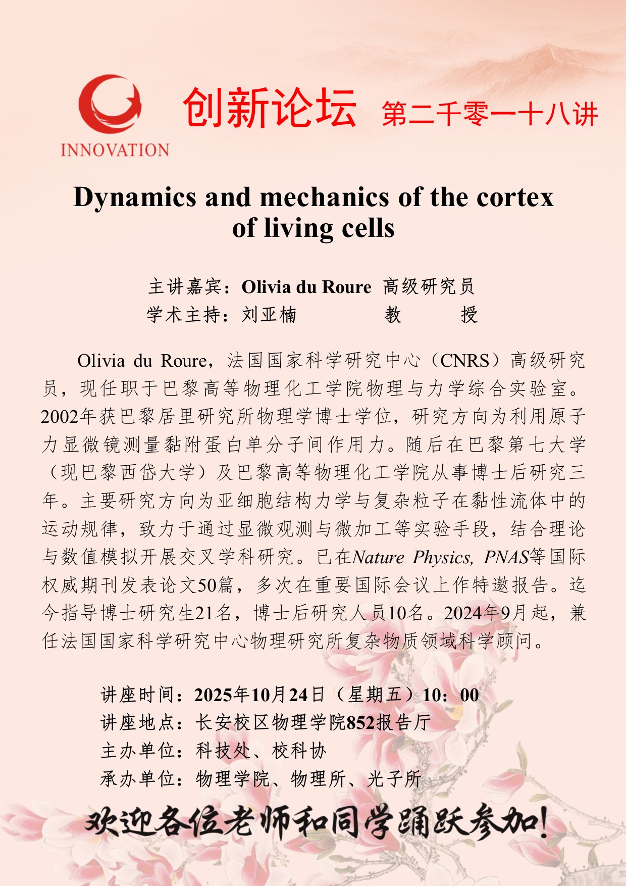Olivia du Roure 高级研究员 MILAN.COM创新论坛第二千零一十八讲:Dynamics and mechanics of the cortex of living cells 讲座时间 2025年10月24日(星期五)10:00 讲座地点 长安校区物理学院852报告厅 讲座人介绍 Olivia du Roure 高级研究员 讲座内容