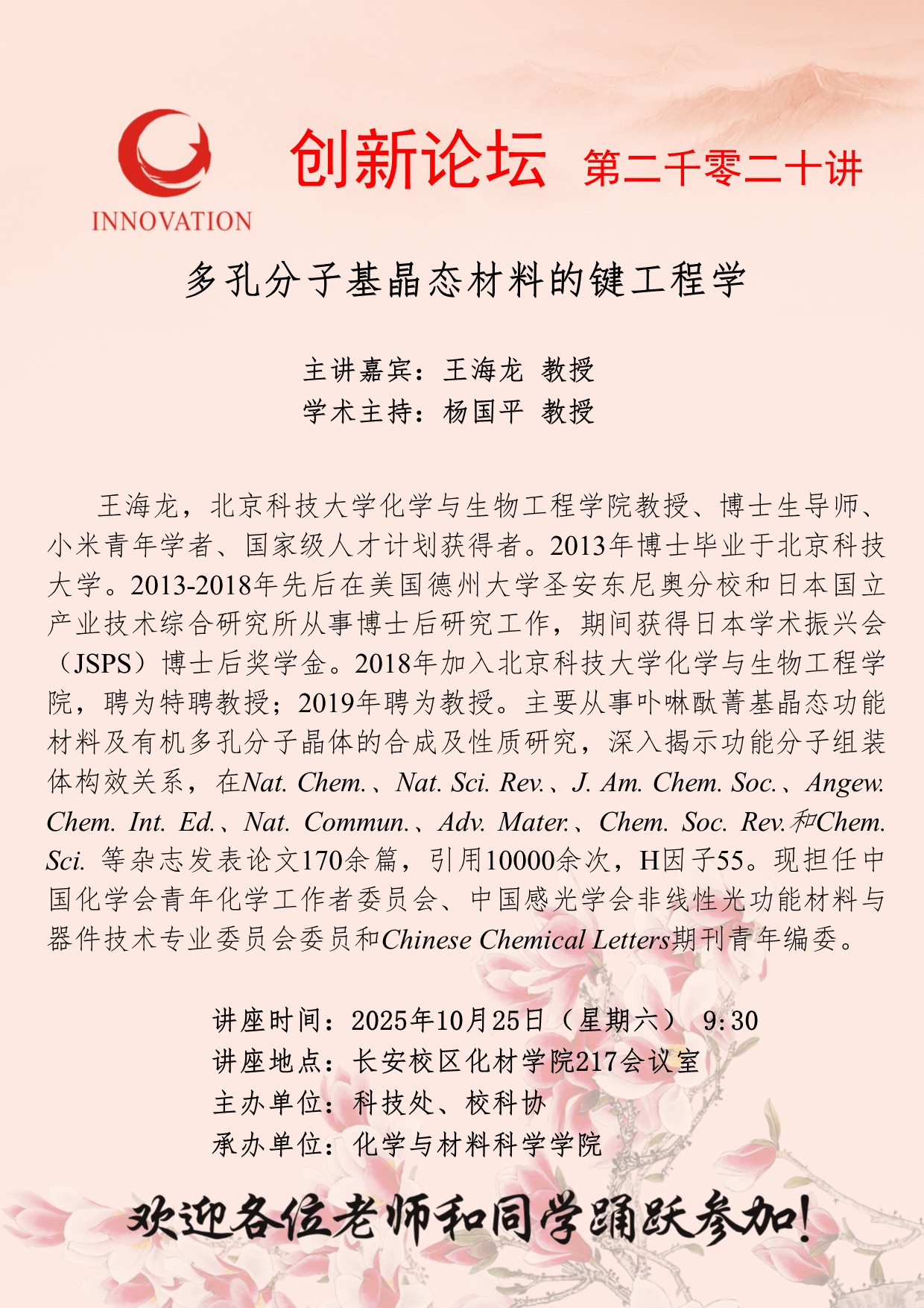 王海龙 教授 MILAN.COM创新论坛第二千零二十讲:多孔分子基晶态材料的键工程学 讲座时间 2025年10月25日(星期六) 9:30 讲座地点 长安校区化材学院217会议室 讲座人介绍 王海龙 教授 讲座内容