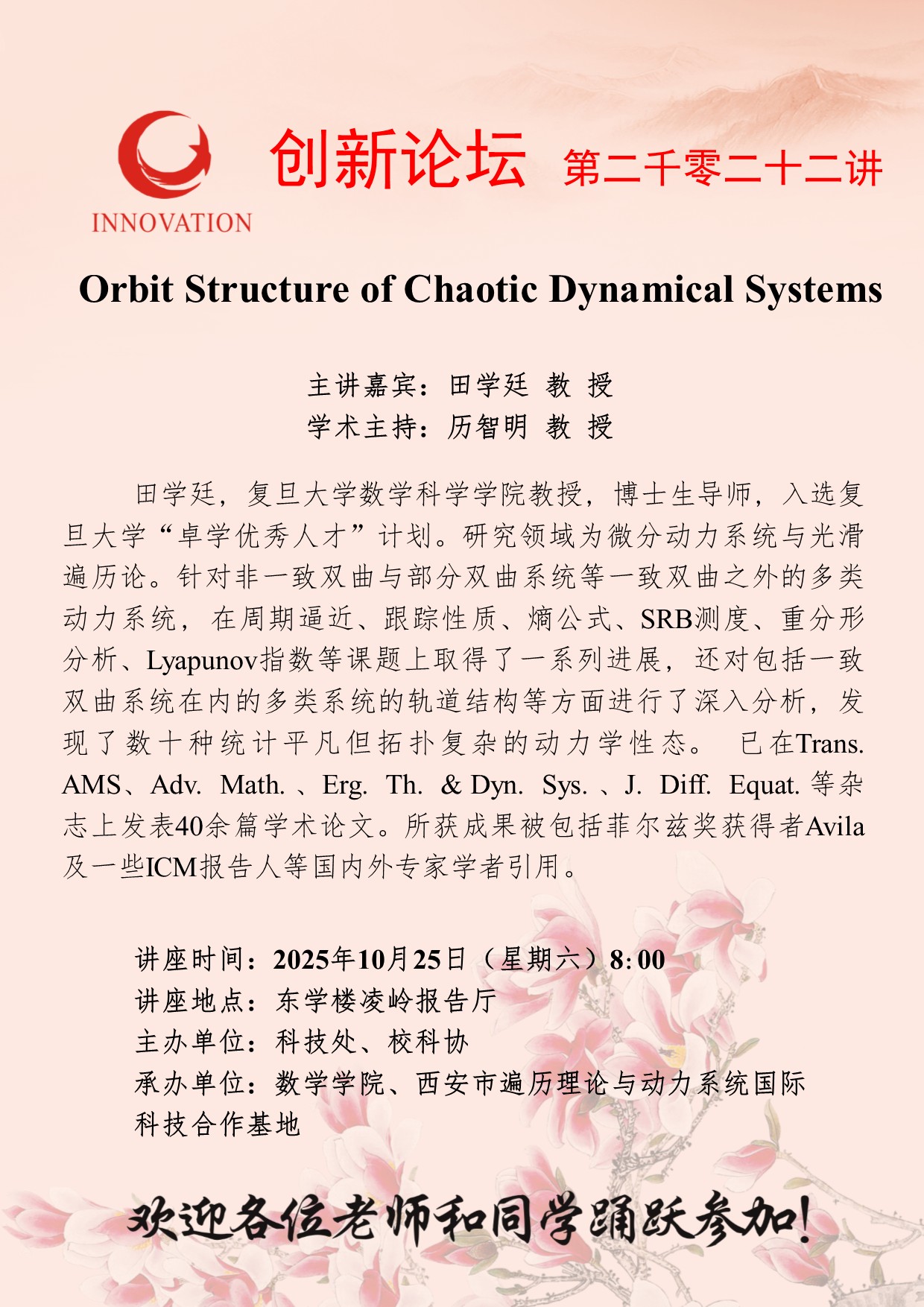田学廷 教 授 MILAN.COM创新论坛第二千零二十二讲:Orbit Structure of Chaotic Dynamical Systems 讲座时间 2025年10月25日(星期六)8:00 讲座地点 东学楼凌岭报告厅 讲座人介绍 田学廷 教 授 讲座内容