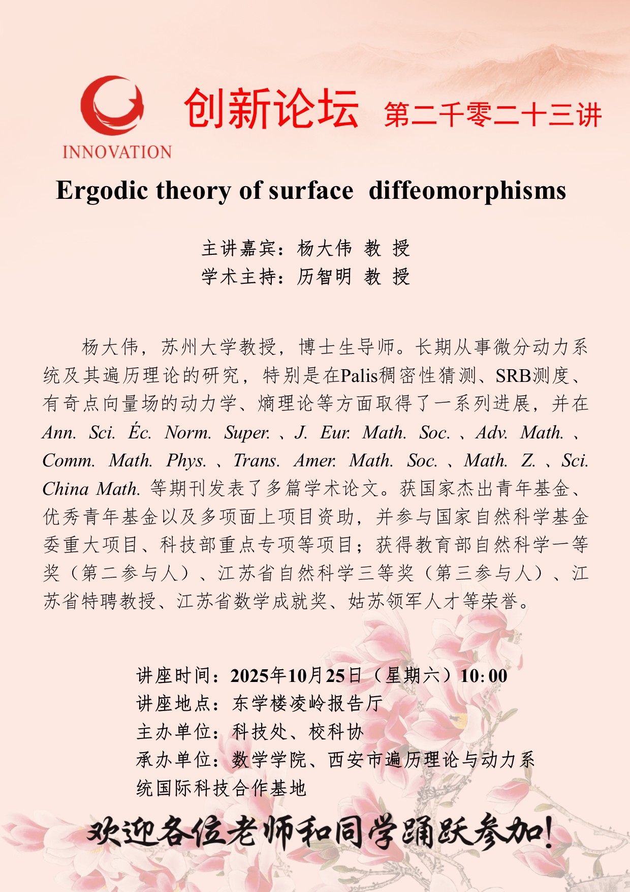 杨大伟 教 授 MILAN.COM创新论坛第二千零二十三讲:Ergodic theory of surface diffeomorphisms 讲座时间 2025年10月25日(星期六)10:00 讲座地点 东学楼凌岭报告厅 讲座人介绍 杨大伟 教 授 讲座内容