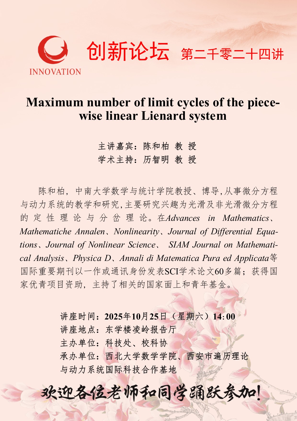 陈和柏 教 授 MILAN.COM创新论坛第二千零二十四讲:Maximum number of limit cycles of the piecewise linear Lienard system 讲座时间 2025年10月25日(星期六)14:00 讲座地点 东学楼凌岭报告厅 讲座人介绍 陈和柏 教 授 讲座内容