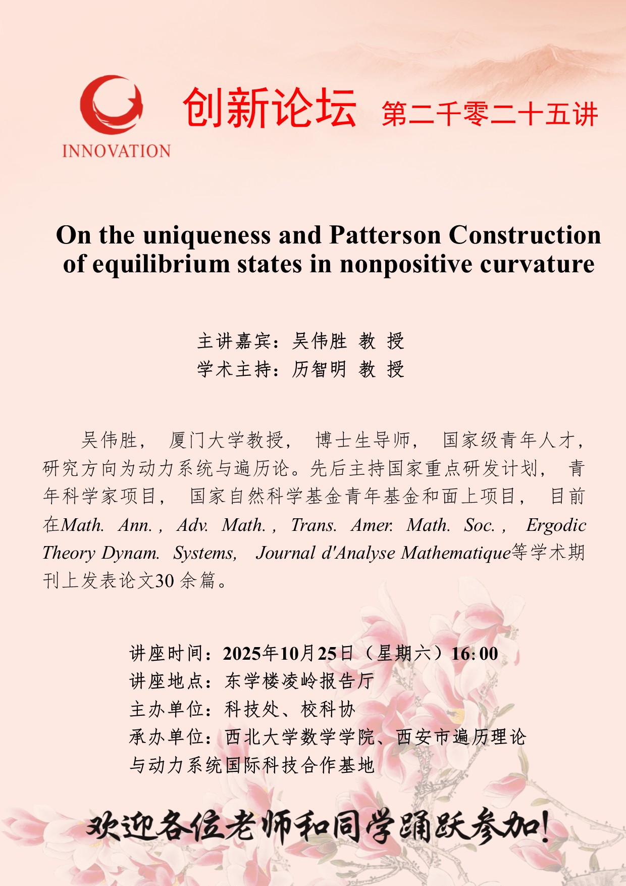吴伟胜 教 授 MILAN.COM创新论坛第二千零二十五讲:On the uniqueness and Patterson Construction of equilibrium states in nonpositive curvature 讲座时间 2025年10月25日(星期六)16:00 讲座地点 东学楼凌岭报告厅 讲座人介绍 吴伟胜 教 授 讲座内容