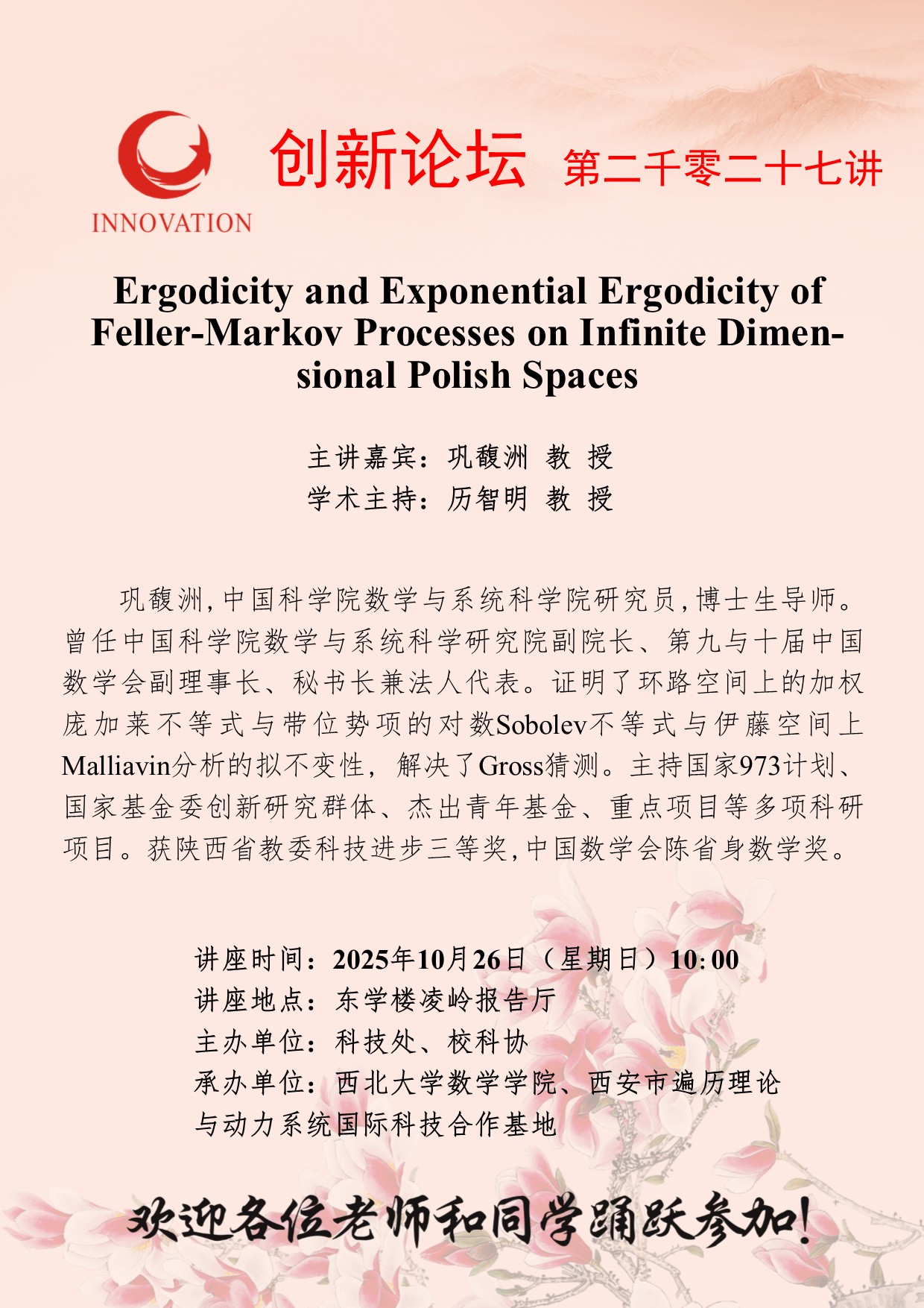 巩馥洲 教 授 MILAN.COM创新论坛第二千零二十七讲:Ergodicity and Exponential Ergodicity of Feller-Markov Processes on Infinite Dimensional Polish Spaces 讲座时间 2025年10月26日(星期日)10:00 讲座地点 东学楼凌岭报告厅 讲座人介绍 巩馥洲 教 授 讲座内容