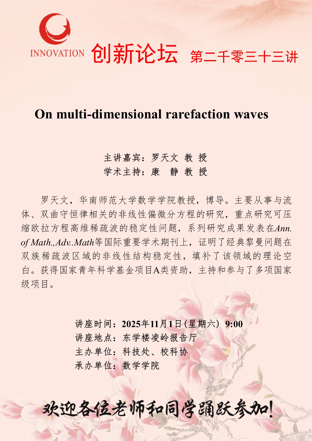 罗天文 教 授 MILAN.COM创新论坛第二千零三十三讲:On multi-dimensional rarefaction waves 讲座时间 2025年11月1日(星期六) 9:00 讲座地点 东学楼凌岭报告厅 讲座人介绍 罗天文 教 授 讲座内容