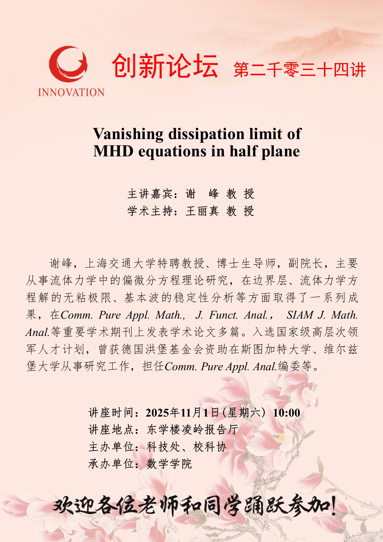 谢 峰 教 授 MILAN.COM创新论坛第二千零三十四讲:Vanishing dissipation limit of MHD equations in half plane 讲座时间 2025年11月1日(星期六) 10:00 讲座地点 东学楼凌岭报告厅 讲座人介绍 谢 峰 教 授 讲座内容