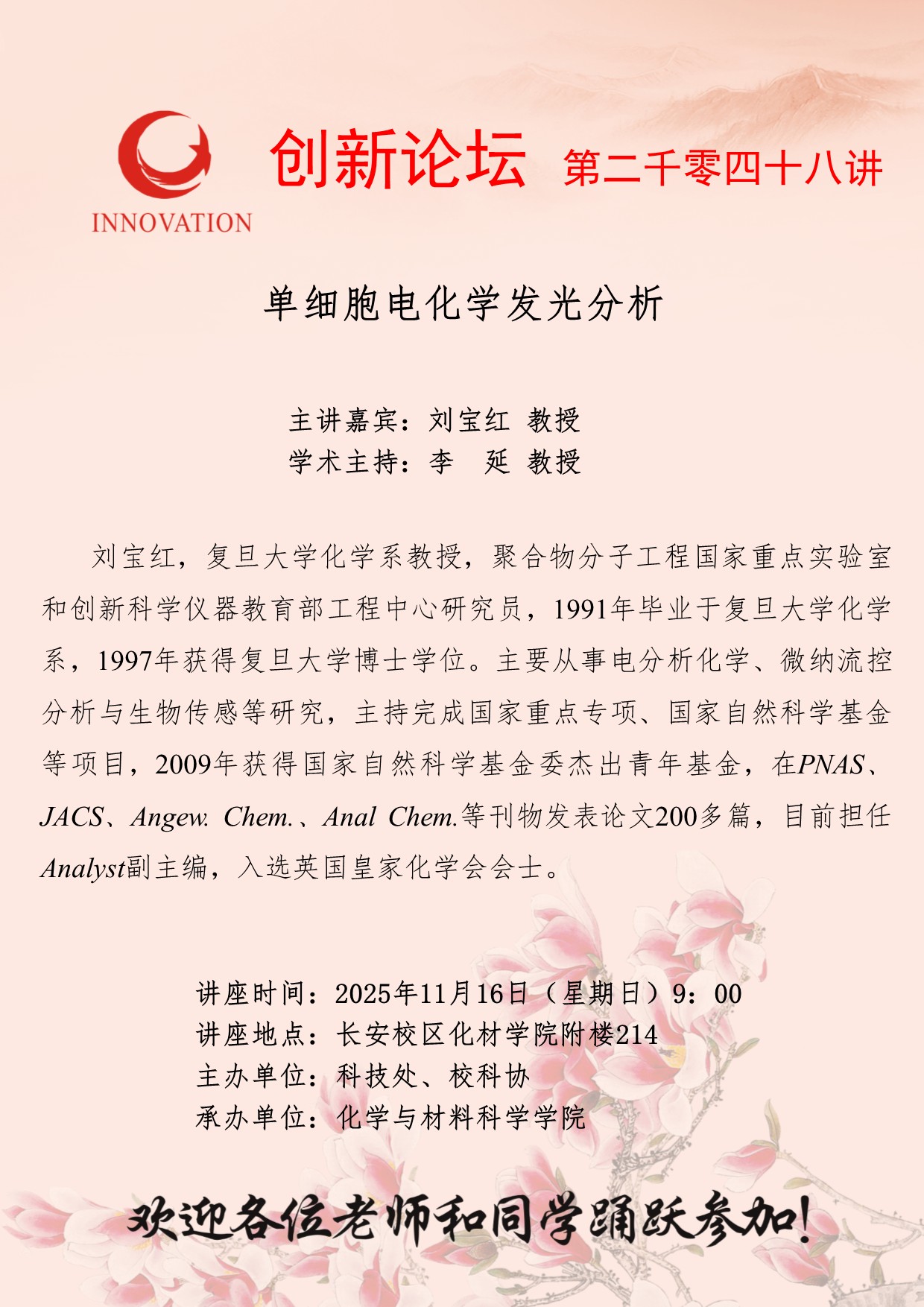 刘宝红 教授 MILAN.COM创新论坛第二千零四十八讲:单细胞电化学发光分析 讲座时间 2025年11月16日(星期日)9:00 讲座地点 长安校区化材学院附楼214 讲座人介绍 刘宝红 教授 讲座内容