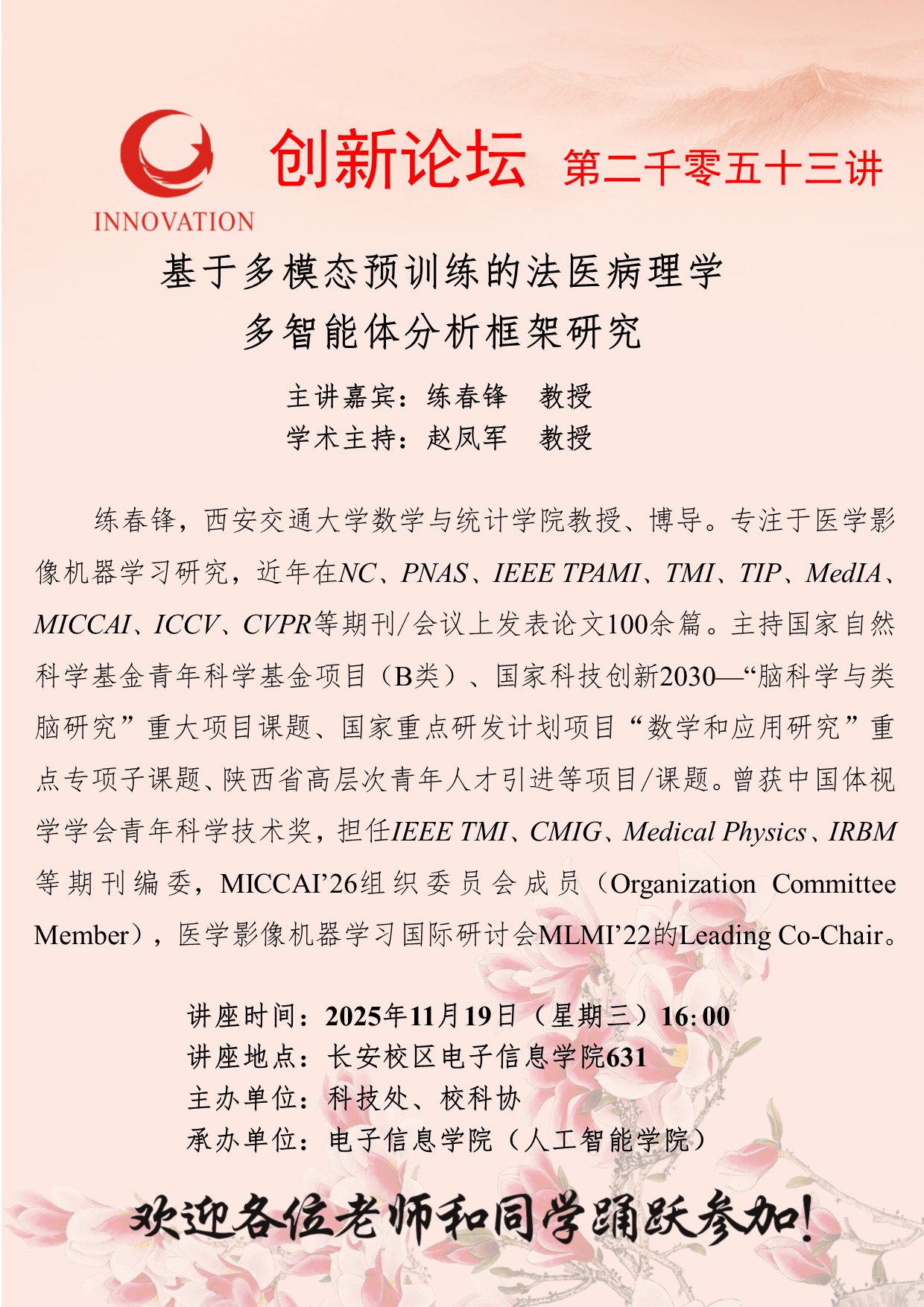 练春锋 教授 MILAN.COM创新论坛第二千零五十三讲:基于多模态预训练的法医病理学多智能体分析框架研究 讲座时间 2025年11月19日(星期三)16:00 讲座地点 长安校区电子信息学院631 讲座人介绍 练春锋 教授 讲座内容