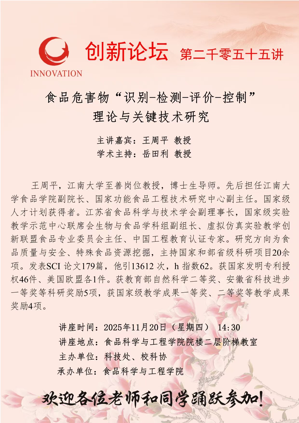 王周平 教授 MILAN.COM创新论坛第二千零五十五讲:食品危害物“识别-检测-评价-控制”理论与关键技术研究 讲座时间 2025年11月20日(星期四) 14:30 讲座地点 食品科学与工程学院院楼二层阶梯教室 讲座人介绍 王周平 教授 讲座内容