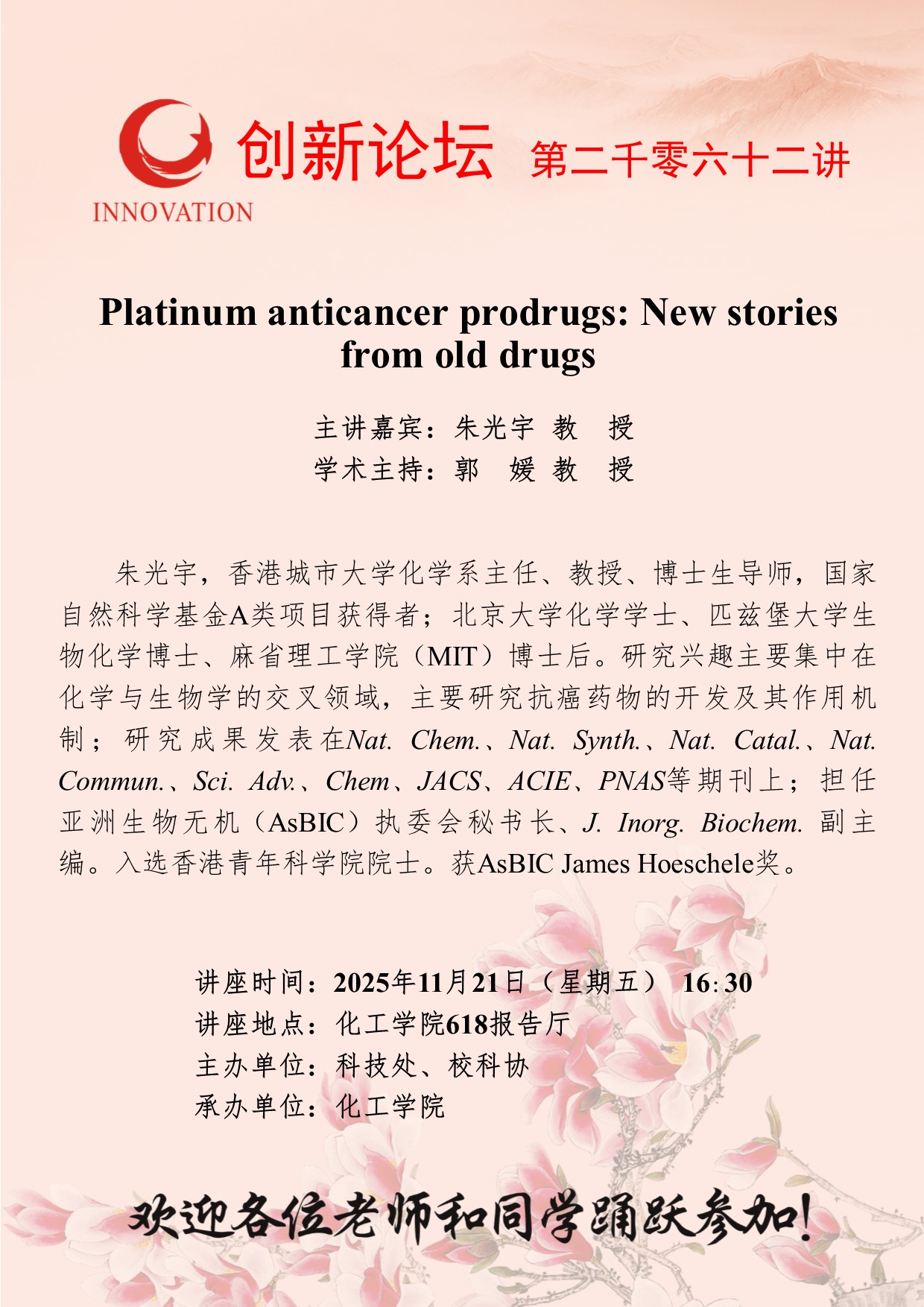 朱光宇 教授 MILAN.COM创新论坛第二千零六十二讲:Platinum anticancer prodrugs: New stories from old drugs 讲座时间 2025年11月21日(星期五) 16:30 讲座地点 化工学院618报告厅 讲座人介绍 朱光宇 教授 讲座内容