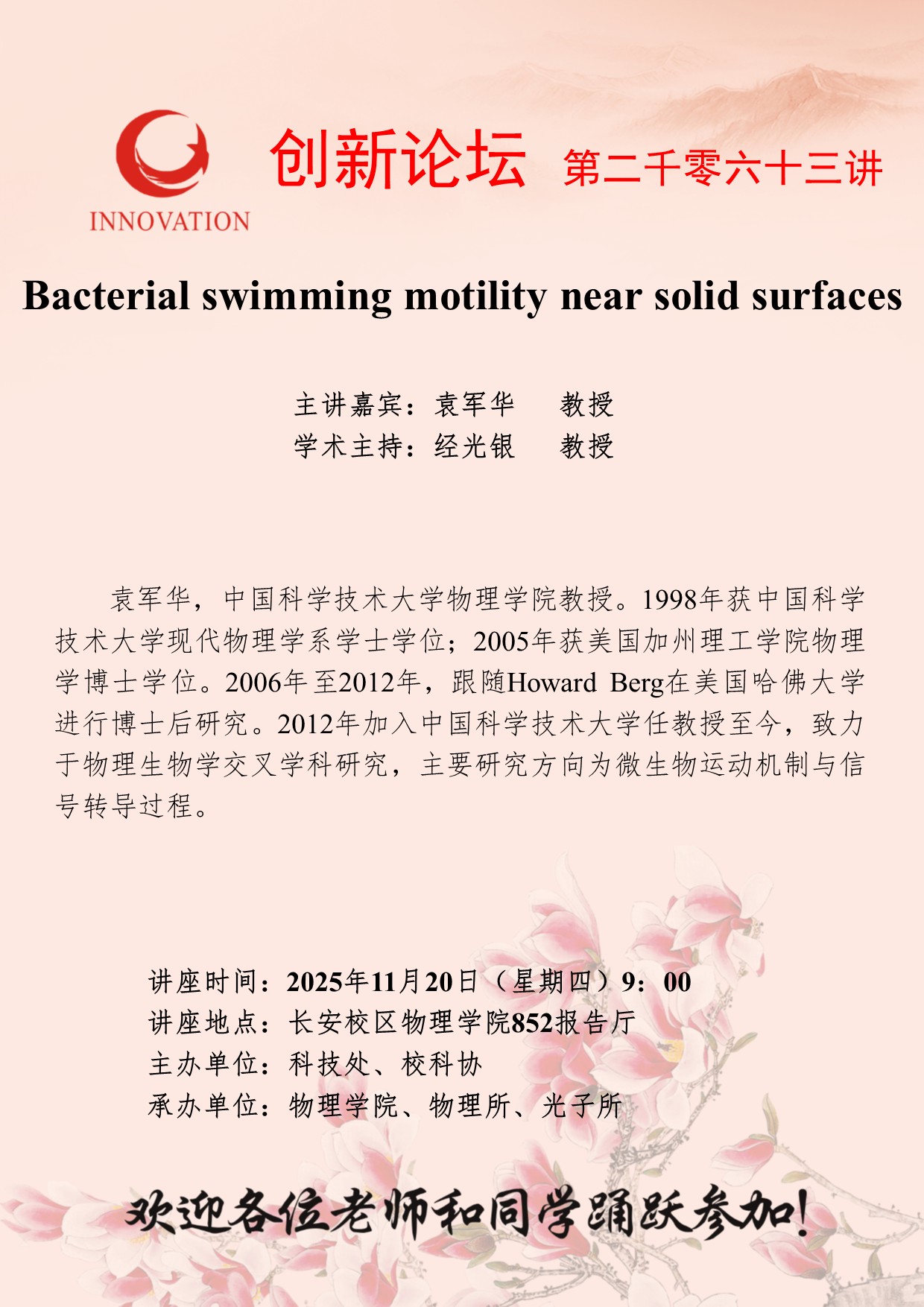 袁军华 教授 MILAN.COM创新论坛第二千零六十三讲:Bacterial swimming motility near solid surfaces 讲座时间 2025年11月20日(星期四)9:00 讲座地点 长安校区物理学院852报告厅 讲座人介绍 袁军华 教授 讲座内容