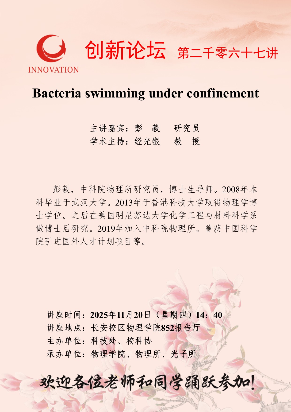 彭毅 研究员 MILAN.COM创新论坛第二千零六十七讲:Bacteria swimming under confinement 讲座时间 2025年11月20日(星期四)14:40 讲座地点 长安校区物理学院852报告厅 讲座人介绍 彭毅 研究员 讲座内容
