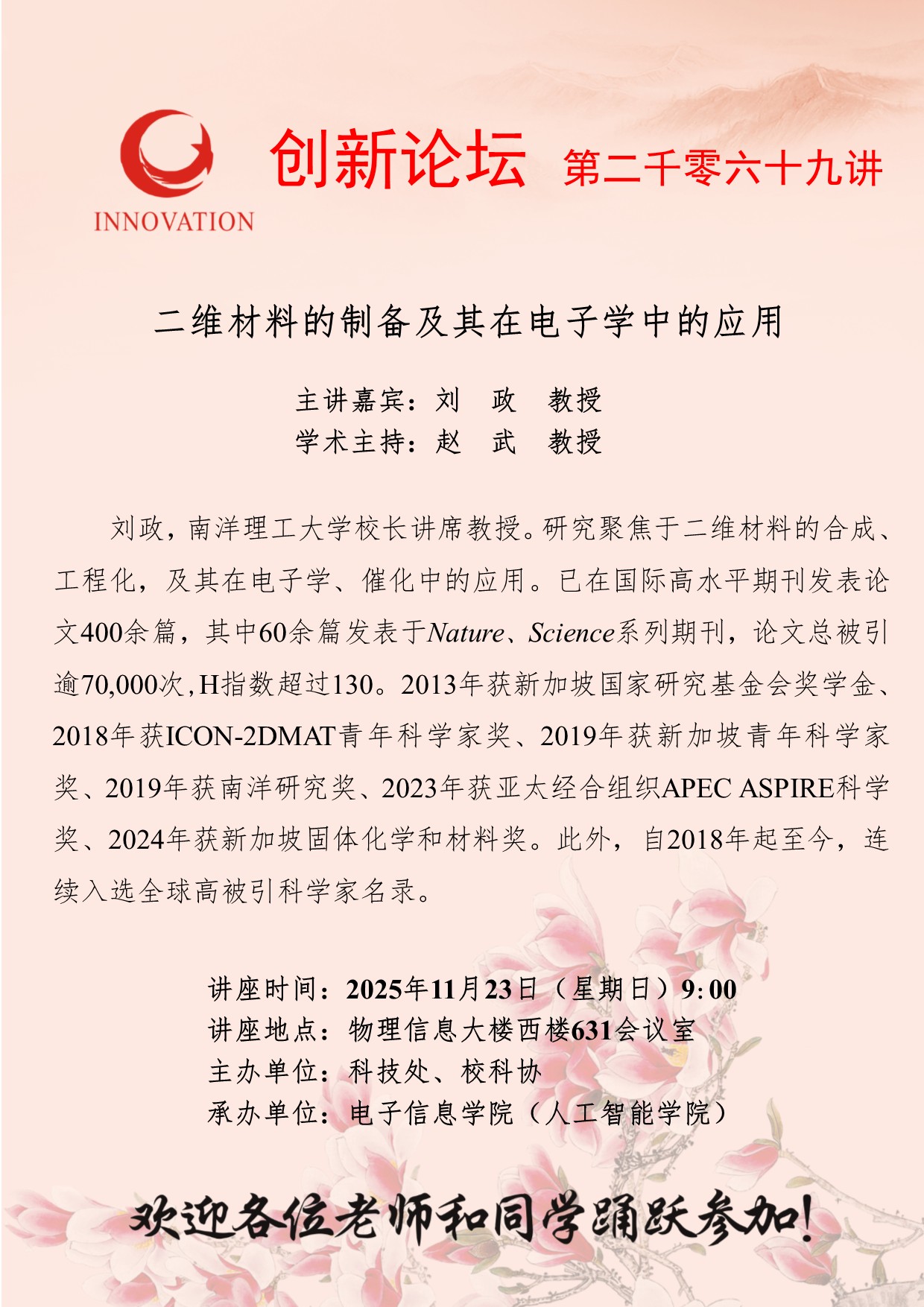 刘政 教授 MILAN.COM创新论坛第二千零六十九讲:二维材料的制备及其在电子学中的应用 讲座时间 2025年11月23日(星期日)9:00 讲座地点 物理信息大楼西楼631会议室 讲座人介绍 刘政 教授 讲座内容