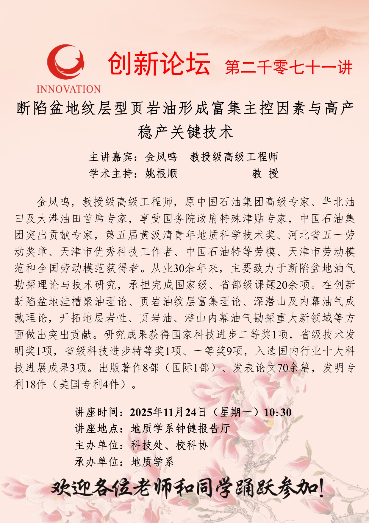 金凤鸣 教授级高级工程师 MILAN.COM创新论坛第二千零七十一讲:断陷盆地纹层型页岩油形成富集主控因素与高产稳产关键技术 讲座时间 2025年11月24日(星期一)10:30 讲座地点 地质学系钟健报告厅 讲座人介绍 金凤鸣 教授级高级工程师 讲座内容