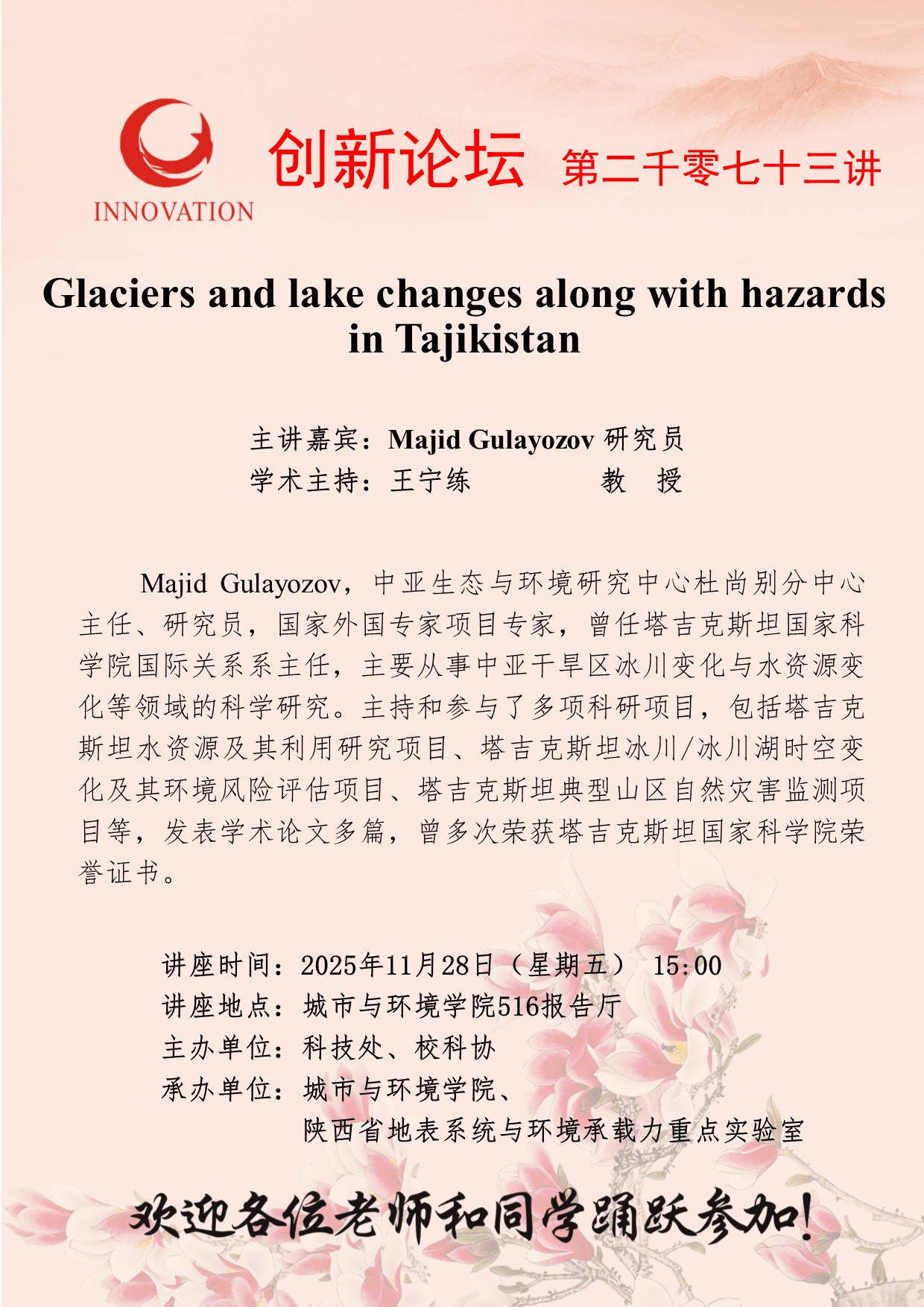 Majid Gulayozov 研究员 MILAN.COM创新论坛第二千零七十三讲:Glaciers and lake changes along with hazards in Tajikistan 讲座时间 2025年11月28日(星期五) 15:00 讲座地点 城市与环境学院516报告厅 讲座人介绍 Majid Gulayozov 研究员 讲座内容