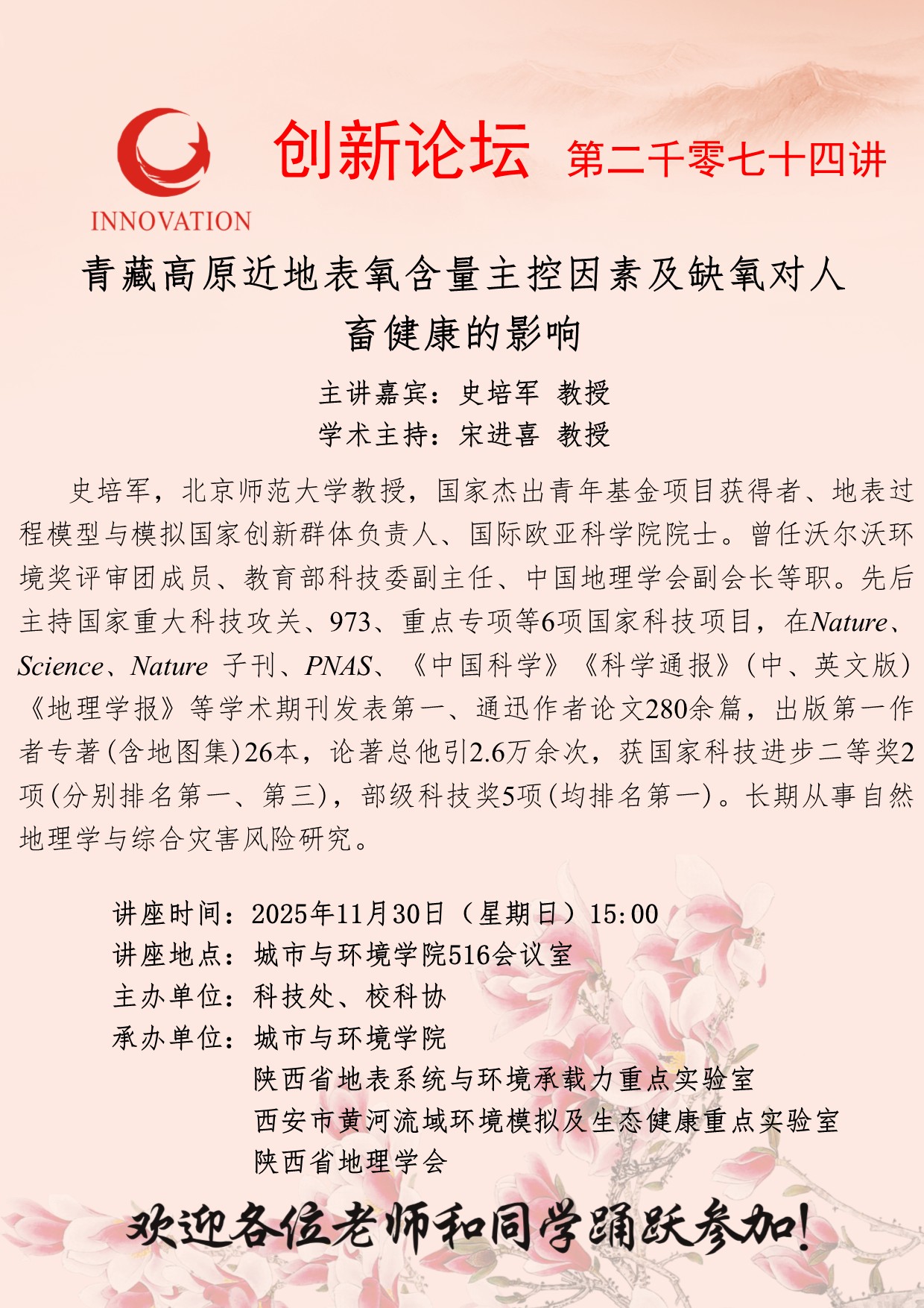 史培军 教授 MILAN.COM创新论坛第二千零七十四讲:青藏高原近地表氧含量主控因素及缺氧对人畜健康的影响 讲座时间 2025年11月30日(星期日)15:00 讲座地点 城市与环境学院516会议室 讲座人介绍 史培军 教授 讲座内容