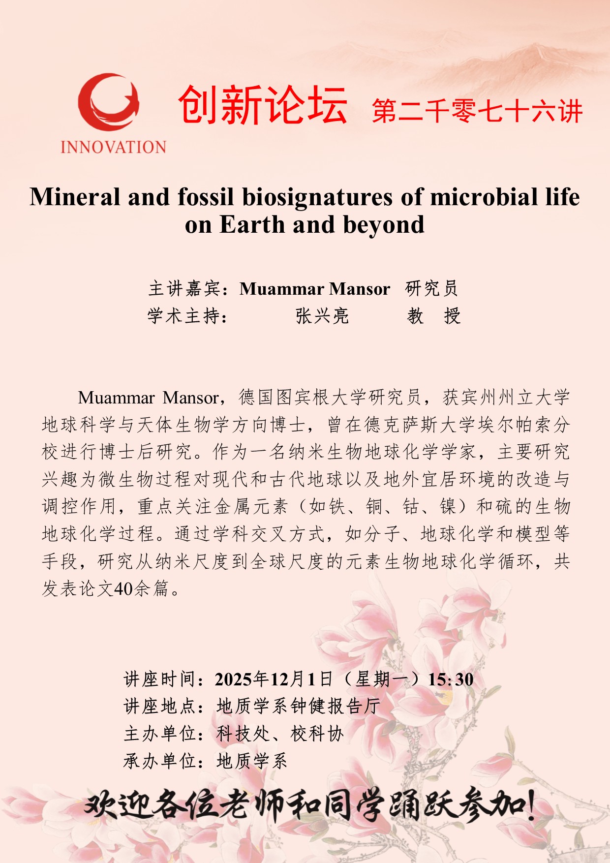 Muammar Mansor 研究员 MILAN.COM创新论坛第二千零七十六讲:Mineral and fossil biosignatures of microbial life on Earth and beyond 讲座时间 2025年12月1日(星期一)15:30 讲座地点 地质学系钟健报告厅 讲座人介绍 Muammar Mansor 研究员 讲座内容