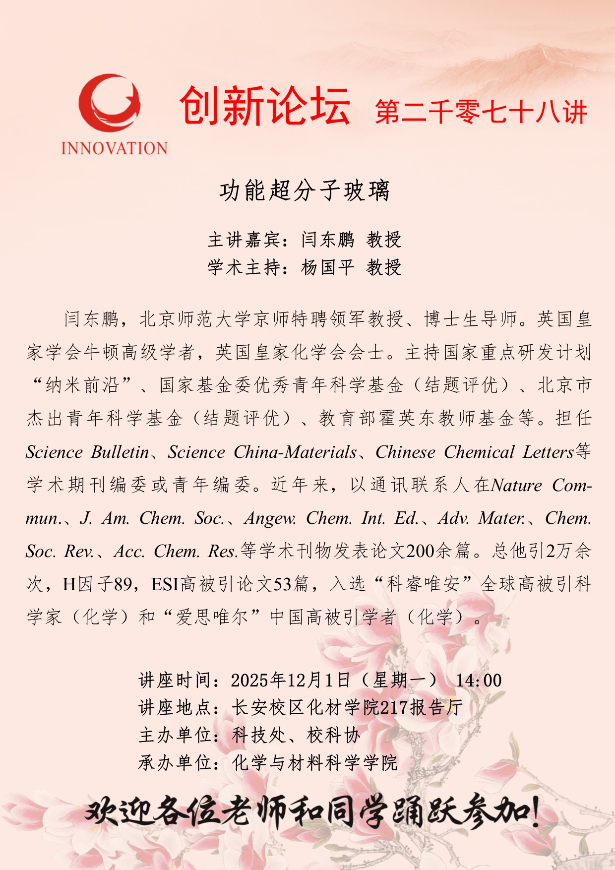 闫东鹏 教授 MILAN.COM创新论坛第二千零七十八讲:功能超分子玻璃 讲座时间 2025年12月1日(星期一) 14:00 讲座地点 长安校区化材学院217报告厅 讲座人介绍 闫东鹏 教授 讲座内容