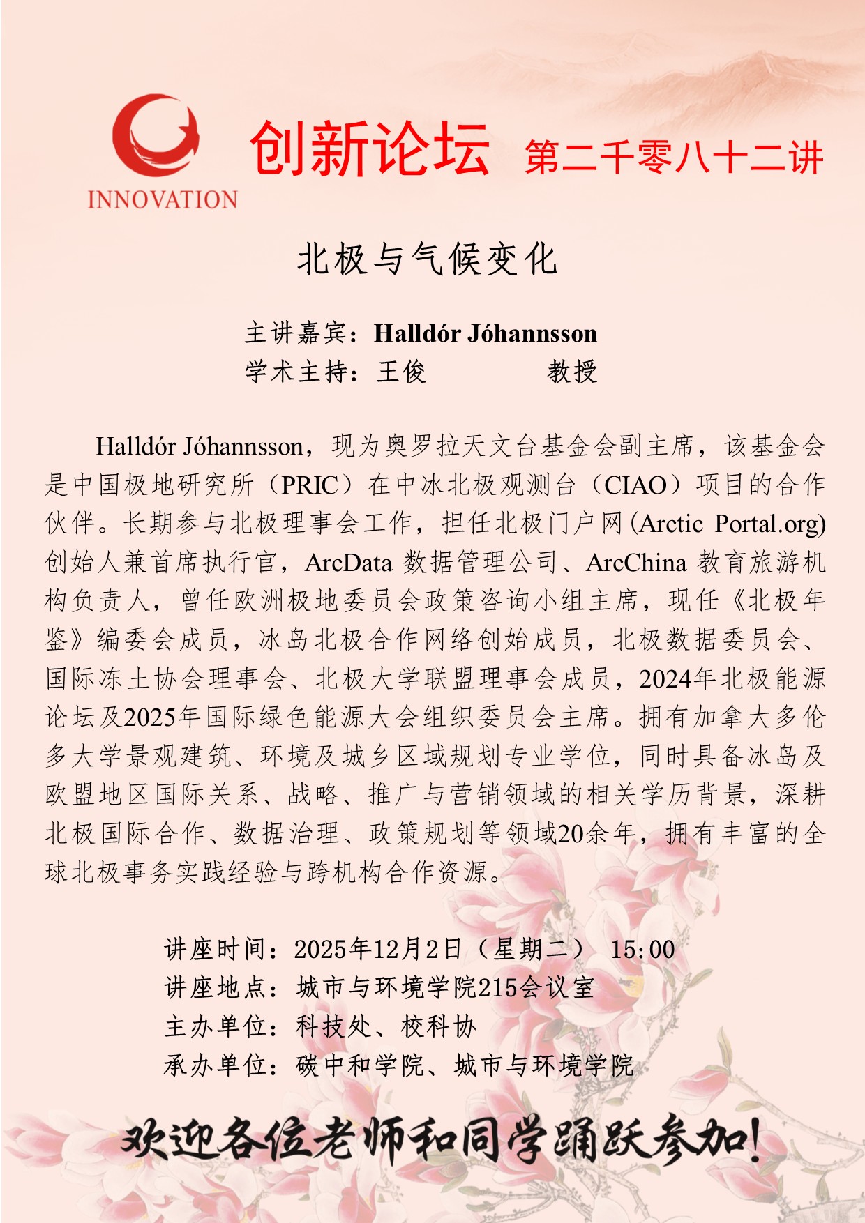 Halldór Jóhannsson MILAN.COM创新论坛第二千零八十二讲:北极与气候变化 讲座时间 2025年12月2日(星期二) 15:00 讲座地点 城市与环境学院215会议室 讲座人介绍 Halldór Jóhannsson 讲座内容