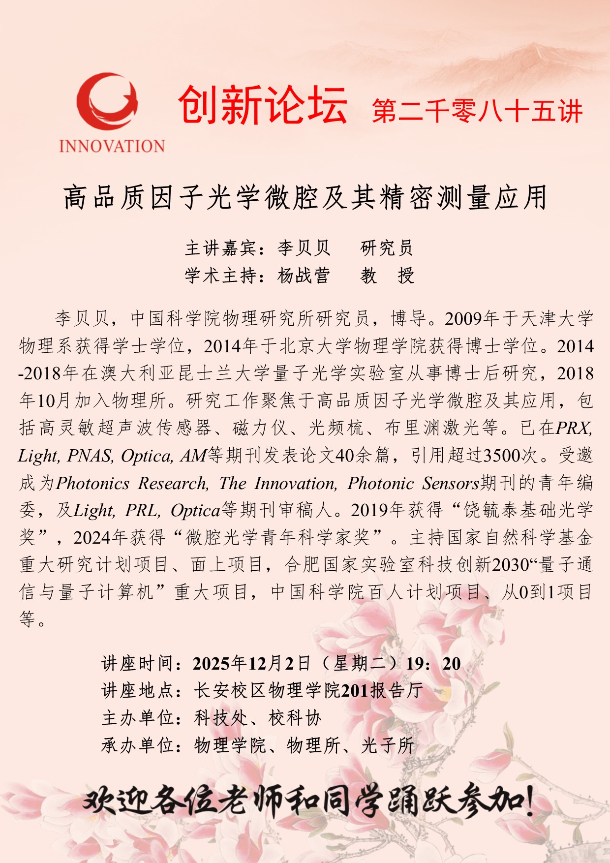 李贝贝 研究员 MILAN.COM创新论坛第二千零八十五讲:高品质因子光学微腔及其精密测量应用 讲座时间 2025年12月2日(星期二)19:20 讲座地点 长安校区物理学院201报告厅 讲座人介绍 李贝贝 研究员 讲座内容