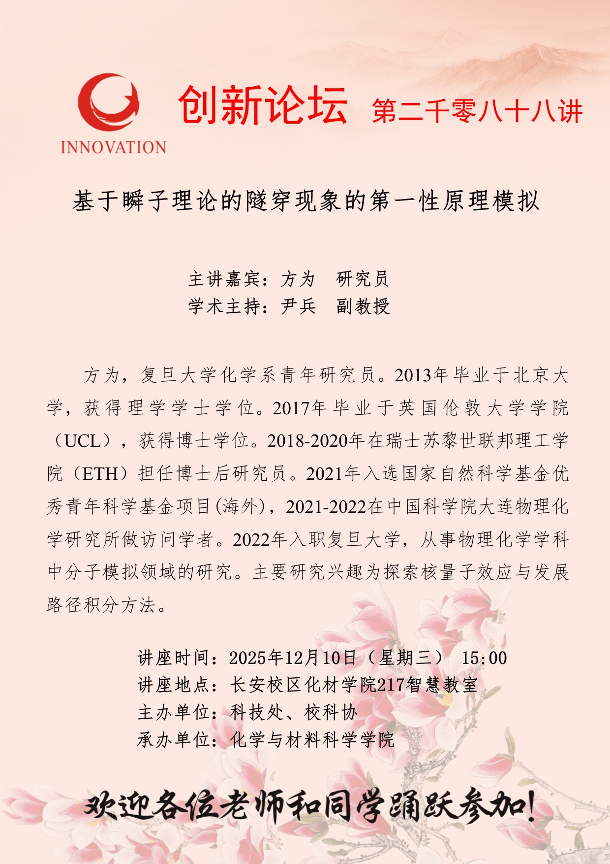 方为 研究员 MILAN.COM创新论坛第二千零八十八讲:基于瞬子理论的隧穿现象的第一性原理模拟 讲座时间 2025年12月10日(星期三) 15:00 讲座地点 长安校区化材学院217智慧教室 讲座人介绍 方为 研究员 讲座内容