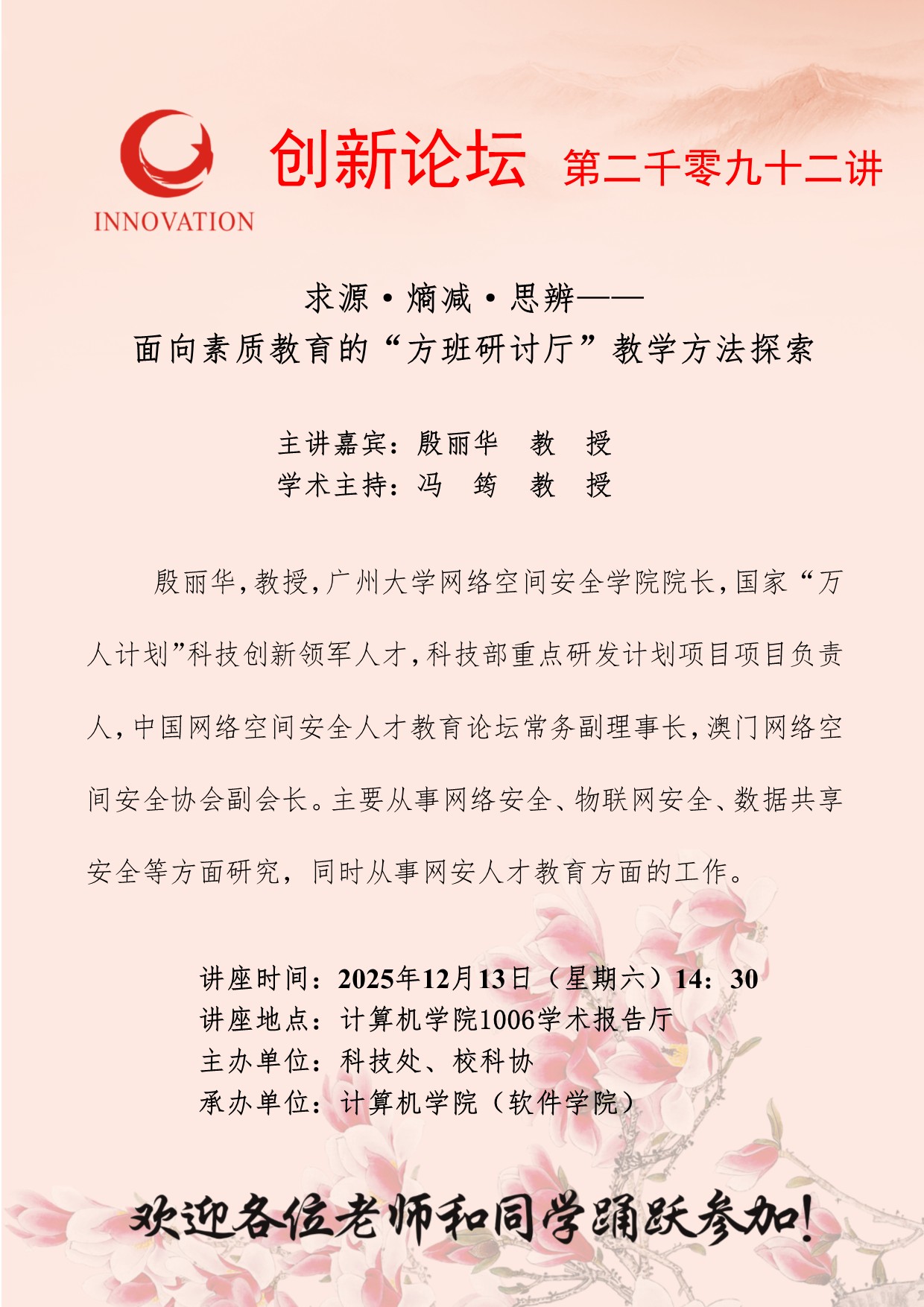 殷丽华 教授 MILAN.COM创新论坛第二千零九十二讲:求源·熵减·思辨——面向素质教育的“方班研讨厅”教学方法探索 讲座时间 2025年12月13日(星期六)14:30 讲座地点 计算机学院1006学术报告厅 讲座人介绍 殷丽华 教授 讲座内容