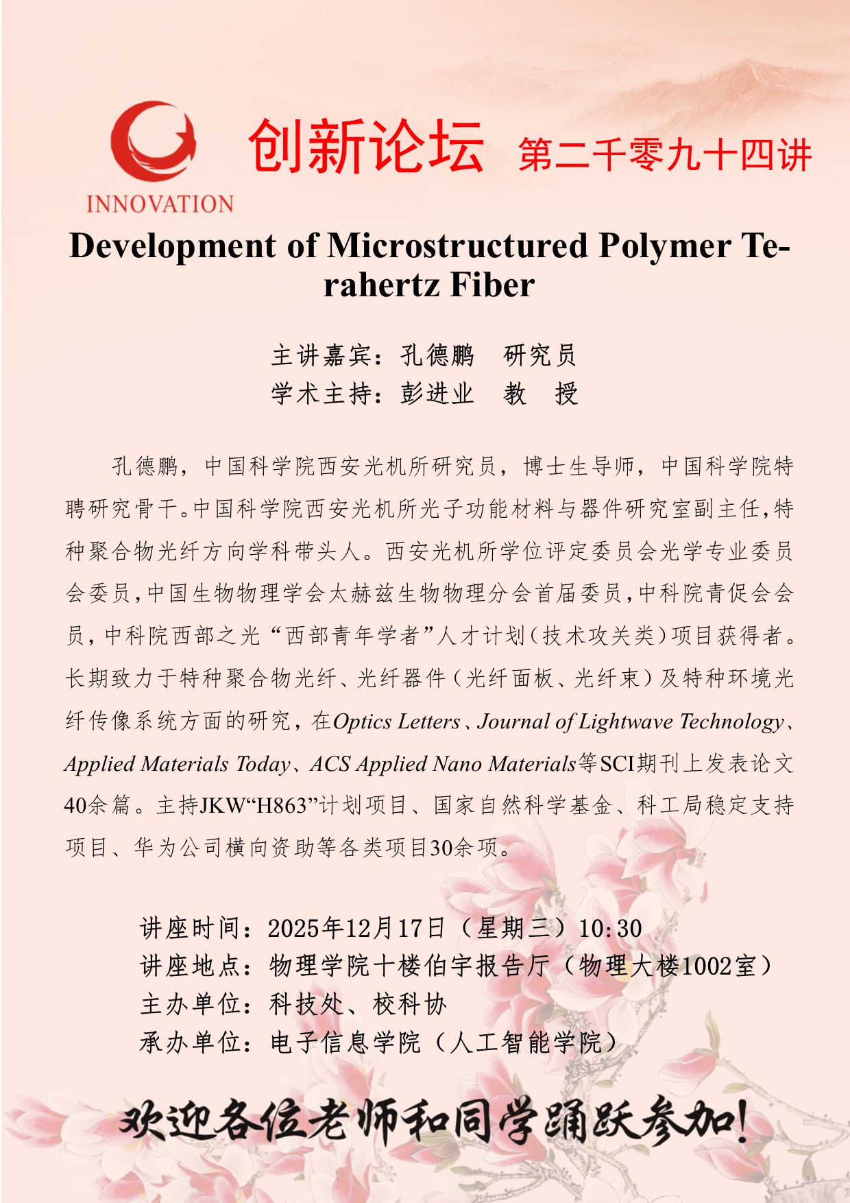 孔德鹏 研究员 MILAN.COM创新论坛第二千零九十四讲:Development of Microstructured Polymer Terahertz Fiber 讲座时间 2025年12月17日(星期三)10:30 讲座地点 物理学院十楼伯宇报告厅(物理大楼1002室) 讲座人介绍 孔德鹏 研究员 讲座内容