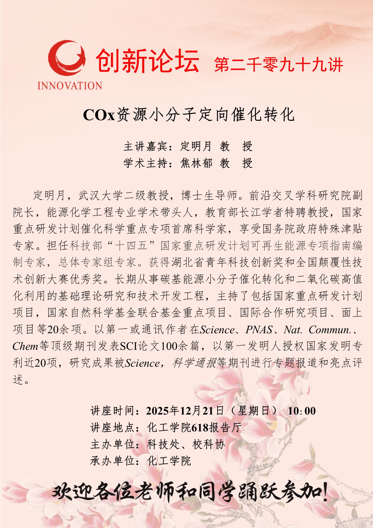 定明月 教授 MILAN.COM创新论坛第二千零九十九讲:COx资源小分子定向催化转化 讲座时间 2025年12月21日(星期日) 10:00 讲座地点 化工学院618报告厅 讲座人介绍 定明月 教授 讲座内容