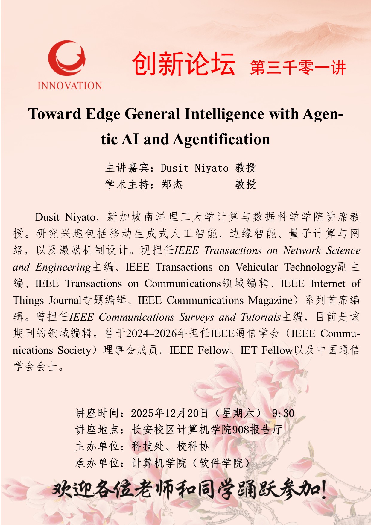 Dusit Niyato 教授 MILAN.COM创新论坛第三千零一讲:Toward Edge General Intelligence with Agentic AI and Agentification 讲座时间 2025年12月20日(星期六) 9:30 讲座地点 长安校区计算机学院908报告厅 讲座人介绍 Dusit Niyato 教授 讲座内容