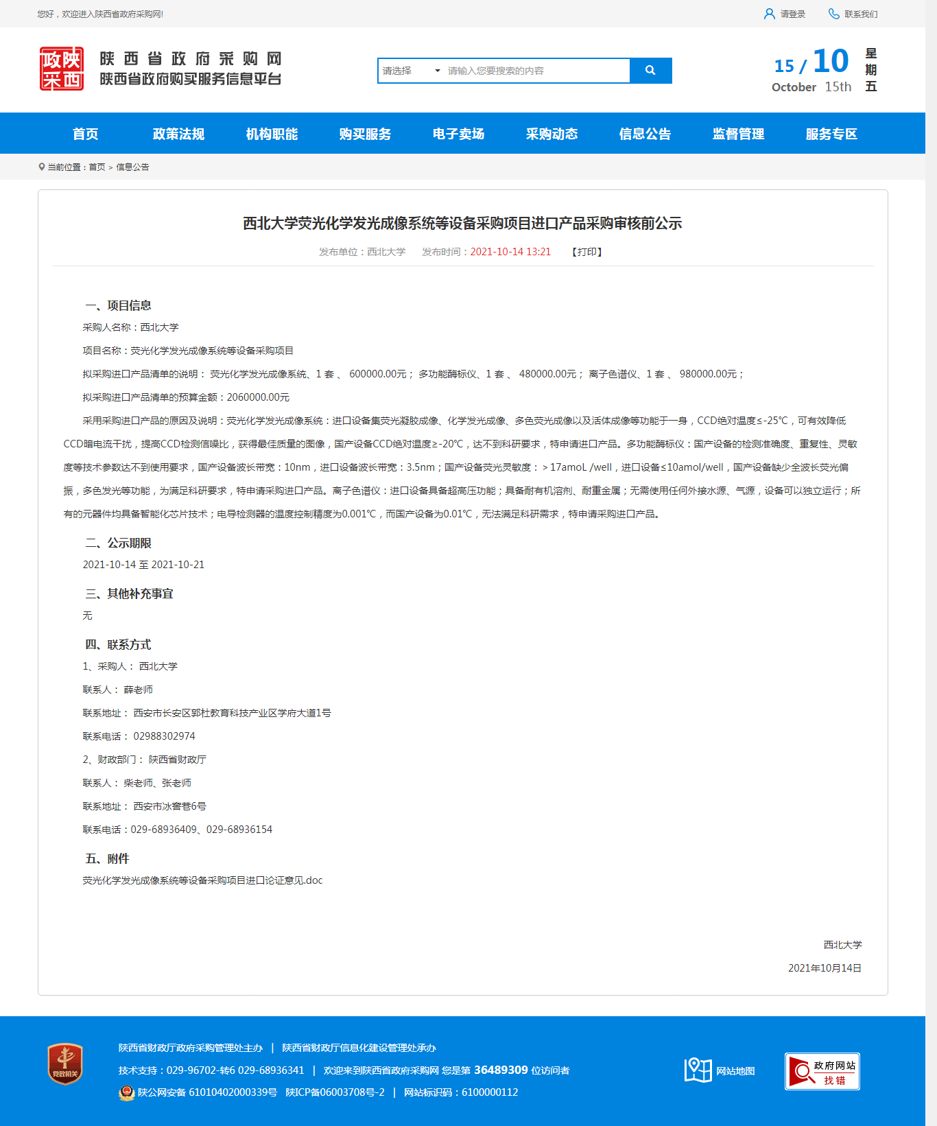 MILAN.COM荧光化学发光成像系统等设备采购项目进口产品采购审核前公示 作者: 编辑:采购与招标办公室 时间:2021-10-15 原公告地址:http://www.ccgp-shaanxi.gov.cn/notice/noticeDetail.do?noticeguid=8a85be327c20d508017c7d292ccd6e1a