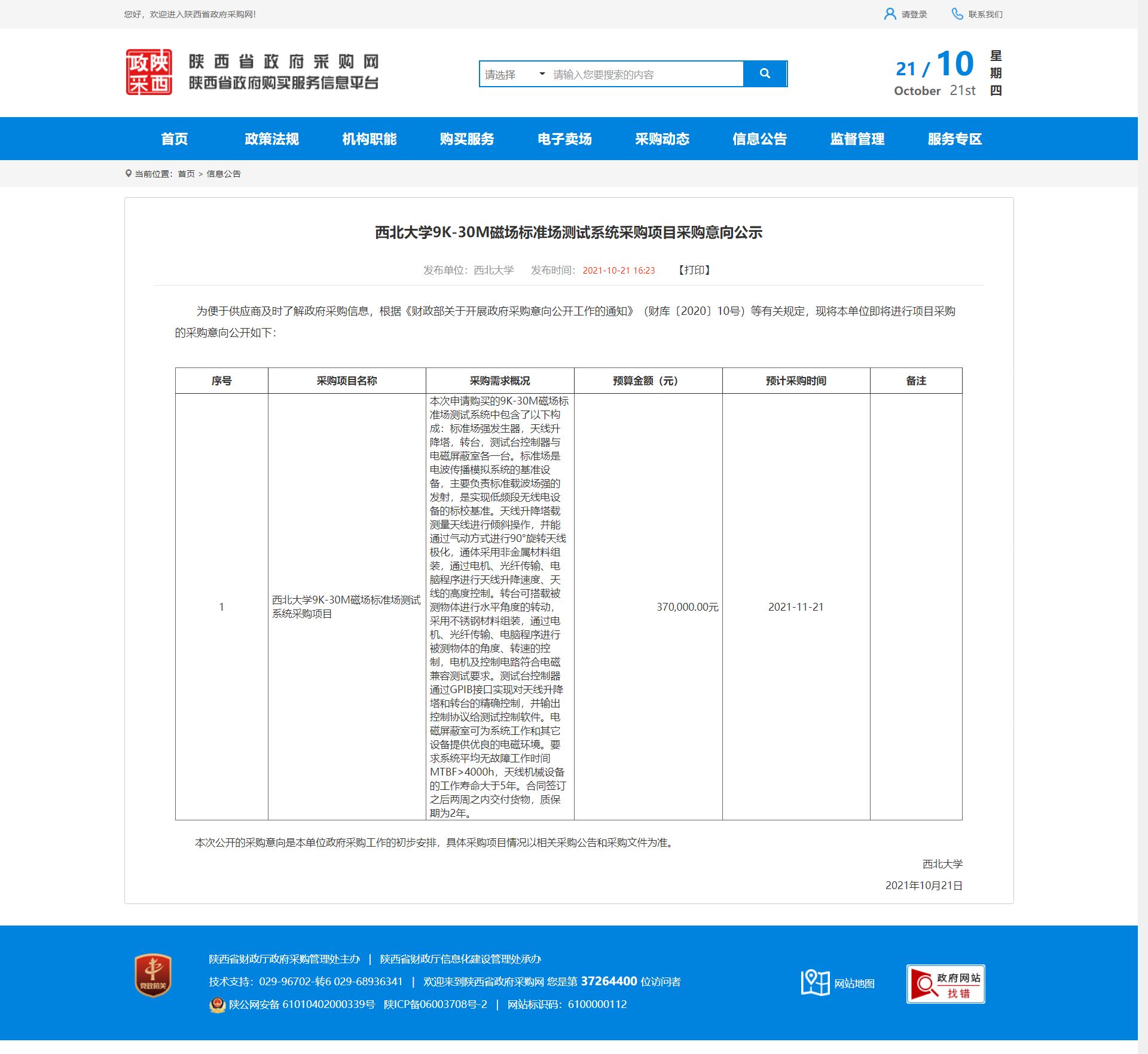MILAN.COM9K-30M磁场标准场测试系统采购项目采购意向公示 作者: 编辑:采购与招标办公室 时间:2021-10-21 原公告地址:http://ccgp-shaanxi.gov.cn/notice/noticeDetail.do?noticeguid=8a85be337c20d0b4017ca1bd9ec34088