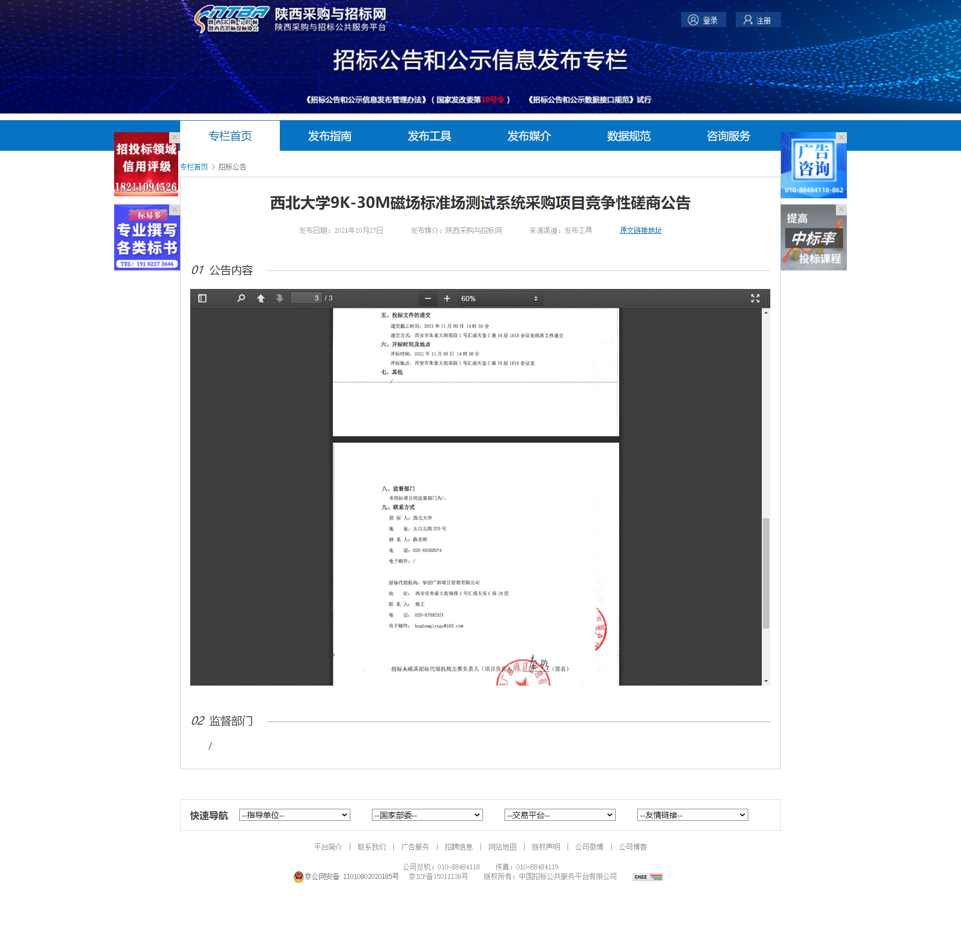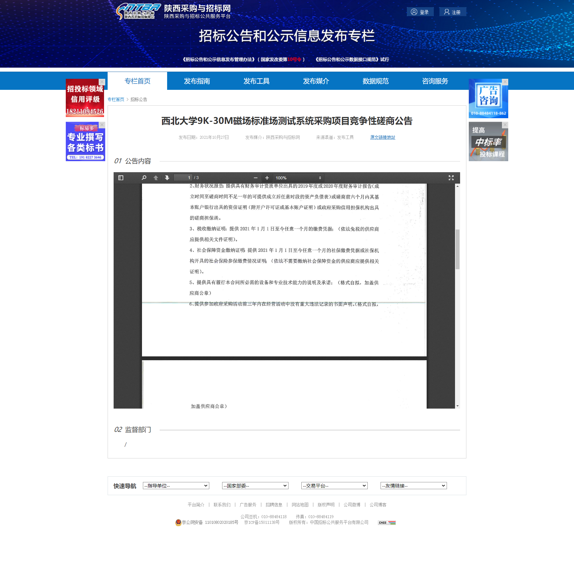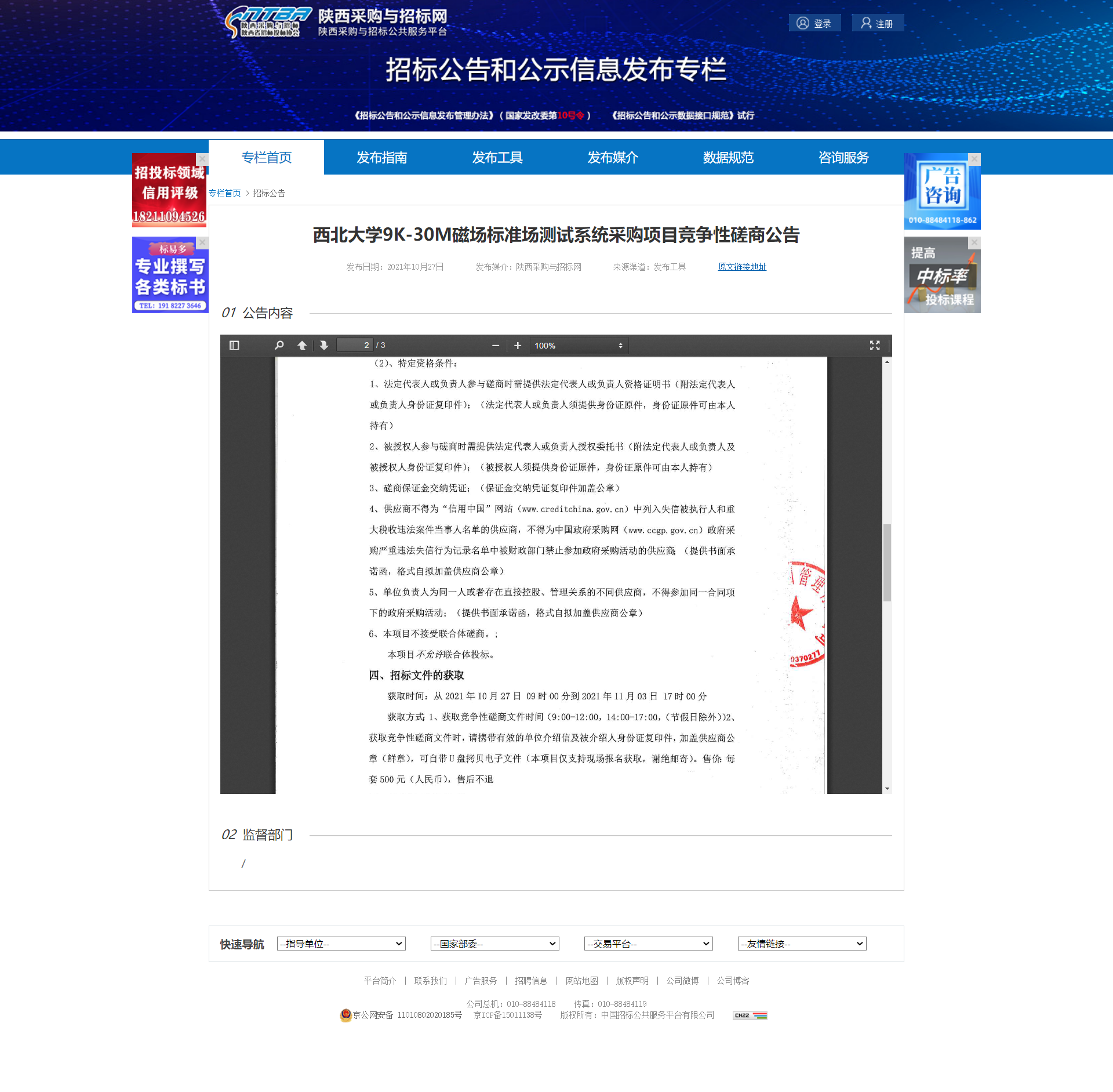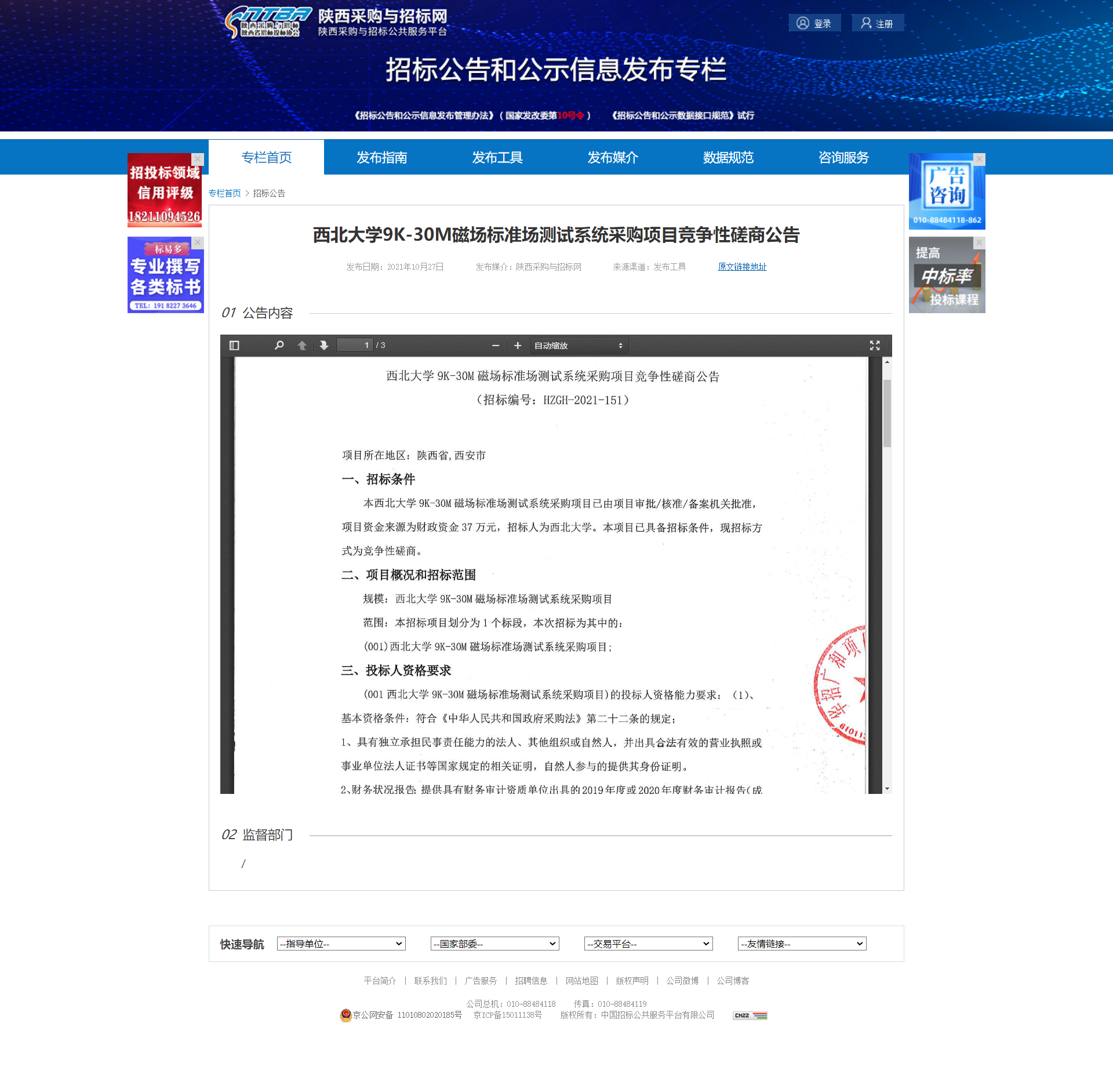 MILAN.COM9K-30M磁场标准场测试系统采购项目竞争性磋商公告 作者: 编辑:薛利娟 时间:2021-10-27 原公告地址:http://bulletin.sntba.com/biddingBulletin/2021-10-27/357751.html