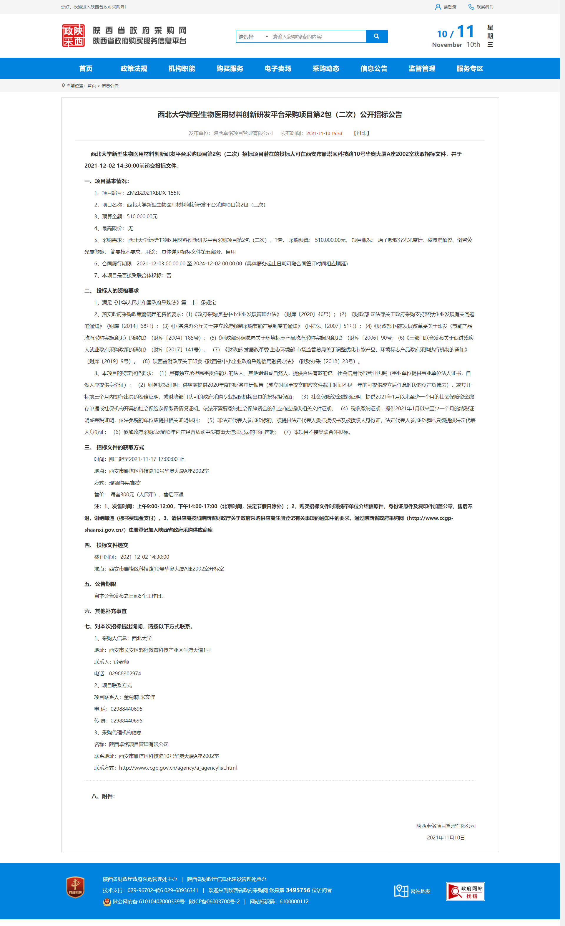 MILAN.COM新型生物医用材料创新研发平台采购项目第2包(二次)公开招标公告 作者: 编辑:薛利娟 时间:2021-11-10 原公告网址:http://www.ccgp-shaanxi.gov.cn/notice/noticeDetail.do?noticeguid=8a85be347cefc0a5017d07ed8f131470