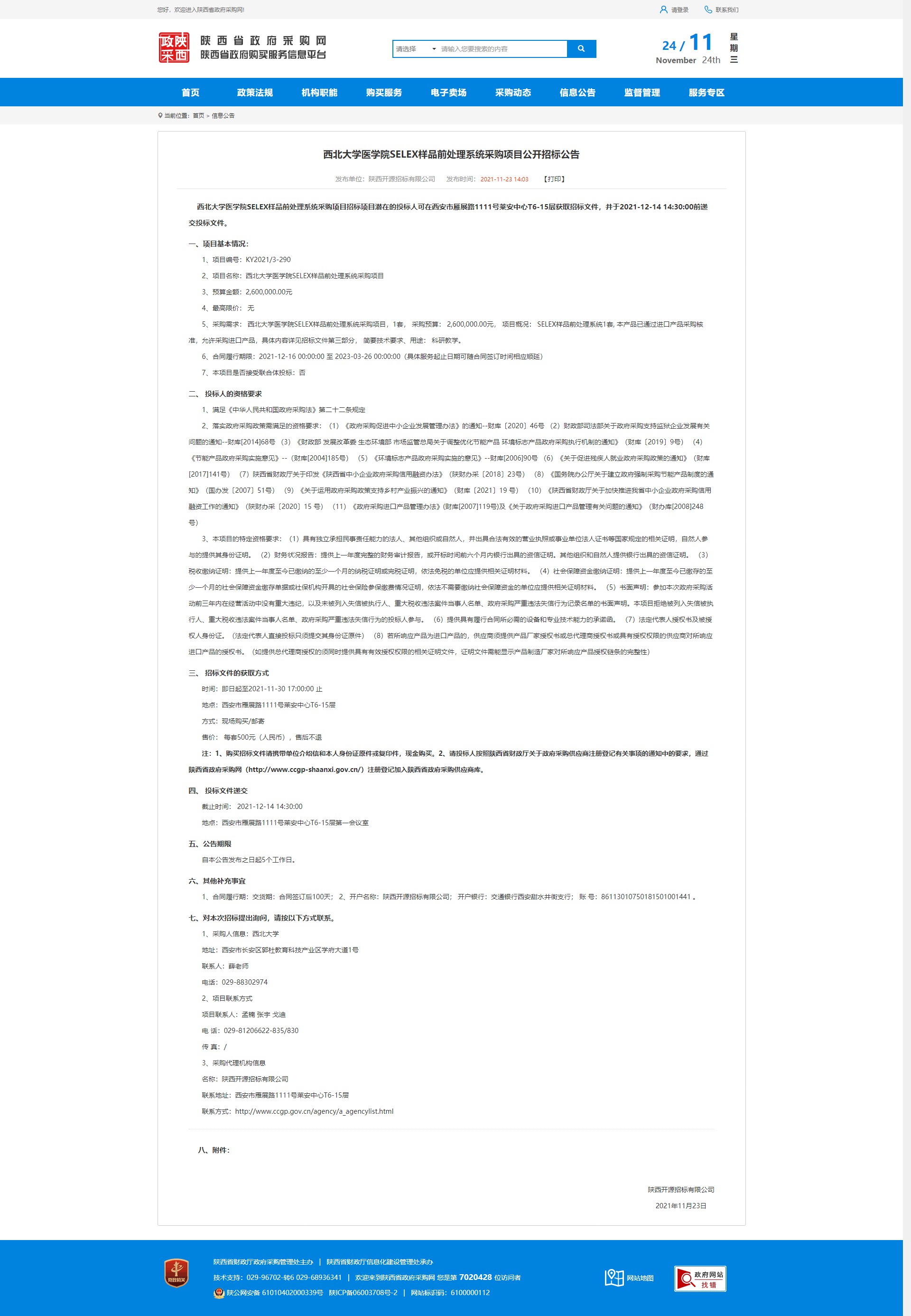 MILAN.COM医学院SELEX样品前处理系统采购项目公开招标公告 作者: 编辑:薛利娟 时间:2021-11-24 原公告网址:http://www.ccgp-shaanxi.gov.cn/notice/noticeDetail.do?noticeguid=8a85be327d2d74ab017d4b5ce2de36ff