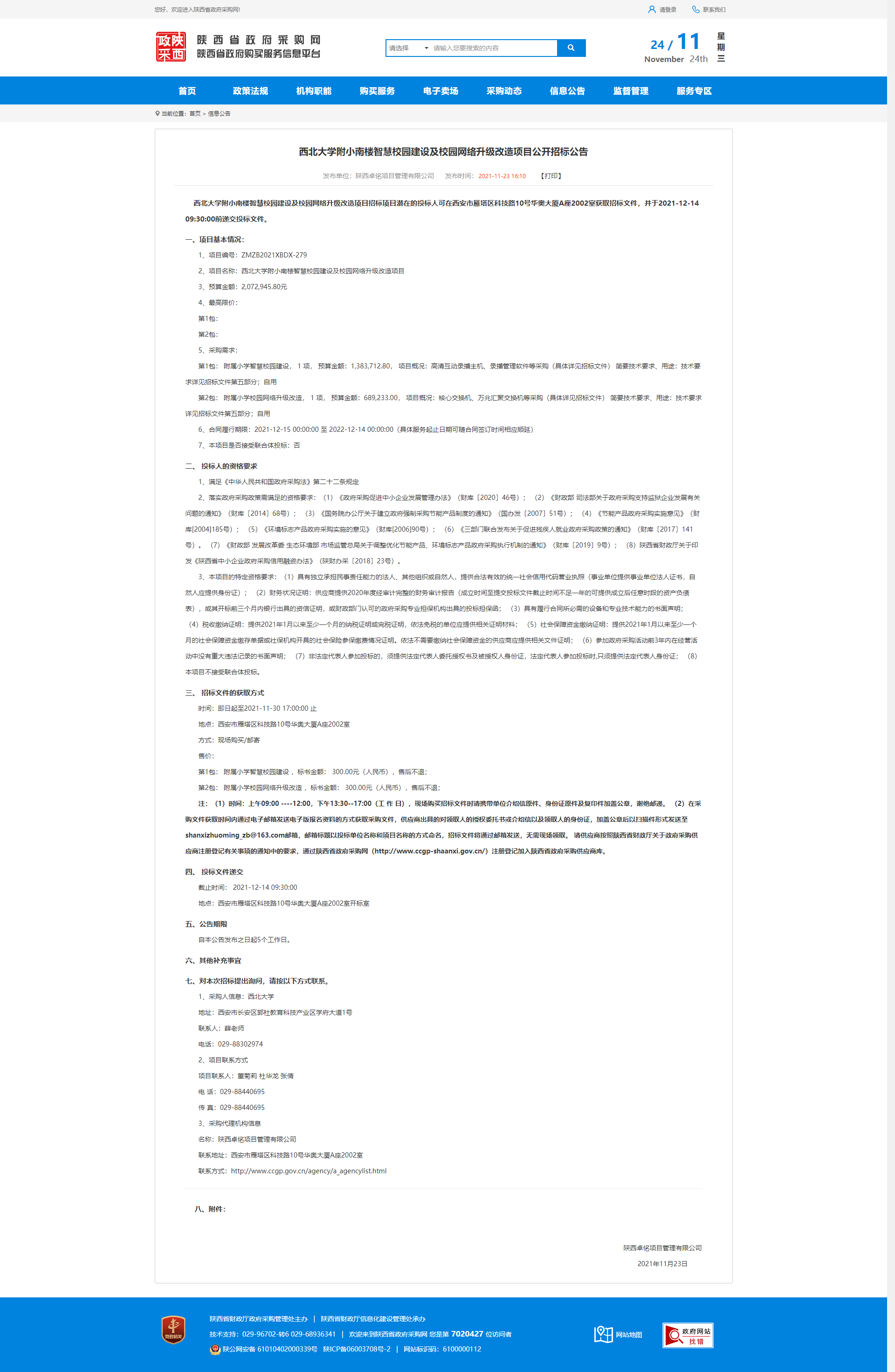 MILAN.COM附小南楼智慧校园建设及校园网络升级改造项目公开招标公告 作者: 编辑:薛利娟 时间:2021-11-24 原公告网址:http://www.ccgp-shaanxi.gov.cn/notice/noticeDetail.do?noticeguid=8a85be347d2d6f8d017d4af0eb515dc6