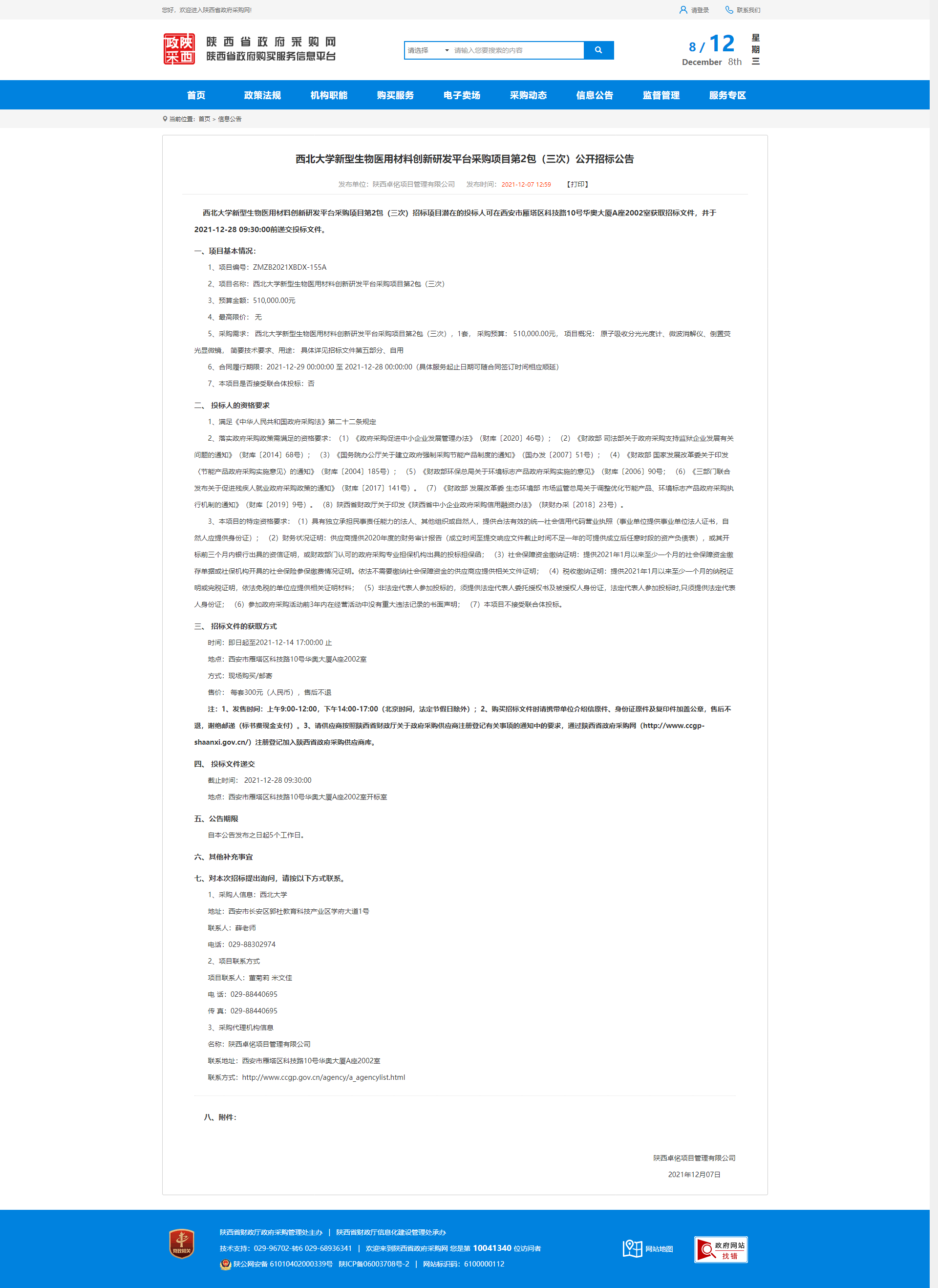MILAN.COM新型生物医用材料创新研发平台采购项目第2包(三次)公开招标公告 作者: 编辑:薛利娟 时间:2021-12-08 原公告链接:http://www.ccgp-shaanxi.gov.cn/notice/noticeDetail.do?noticeguid=8a85be347d6a75c8017d92f597c94e2d
