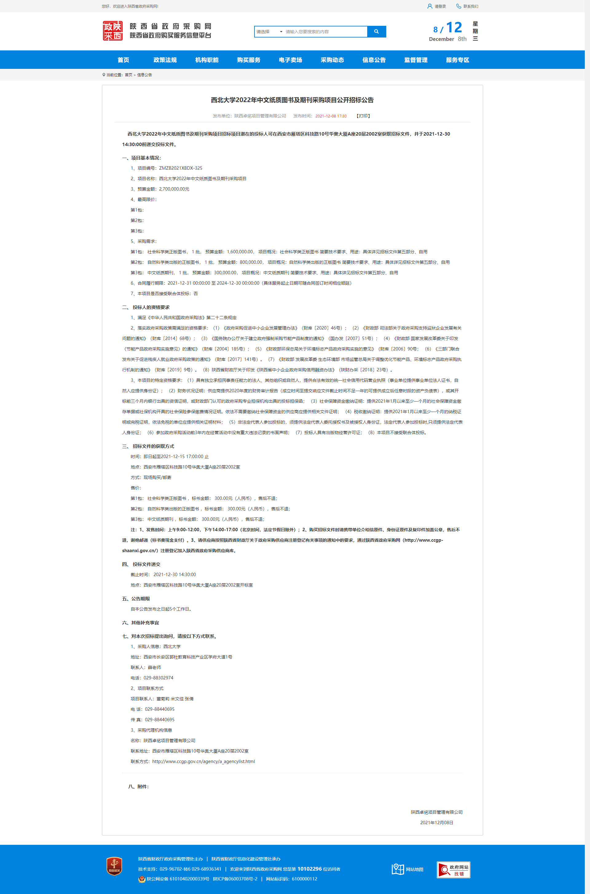 MILAN.COM2022年中文纸质图书及期刊采购项目公开招标公告 作者: 编辑:薛利娟 时间:2021-12-08 原公告链接:http://www.ccgp-shaanxi.gov.cn/notice/noticeDetail.do?noticeguid=8a85be317d6a7607017d991af3612a99