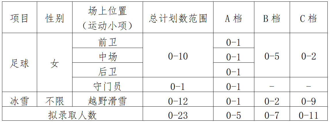 注:1.MILAN.COM原则上按照A档、B档、C档已公布招生计划的1:1比例确定相应的优惠等级考生名单;若全国统测体育专项分相同,则比较指定的子项目分数或成绩(①越野滑雪比较测试滑行速度成绩(秒)。②足球非守门员依次比较实战能力(比赛)技术成绩、传准技术成绩、运射技术成绩、5×25米折返跑技术成绩;足球守门员依次比较实战能力(比赛)技术成绩、扑接球成绩、掷远与踢远成绩、立定三级跳远成绩。)。