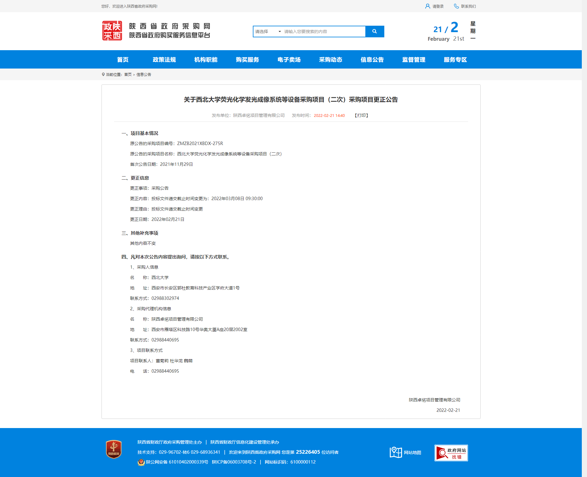 关于MILAN.COM荧光化学发光成像系统等设备采购项目(二次)采购项目更正公告 作者: 编辑:薛利娟 时间:2022-02-21 原公告链接:http://www.ccgp-shaanxi.gov.cn/notice/noticeDetail.do?noticeguid=8a85be317ee7907d017f1aa113f346e8