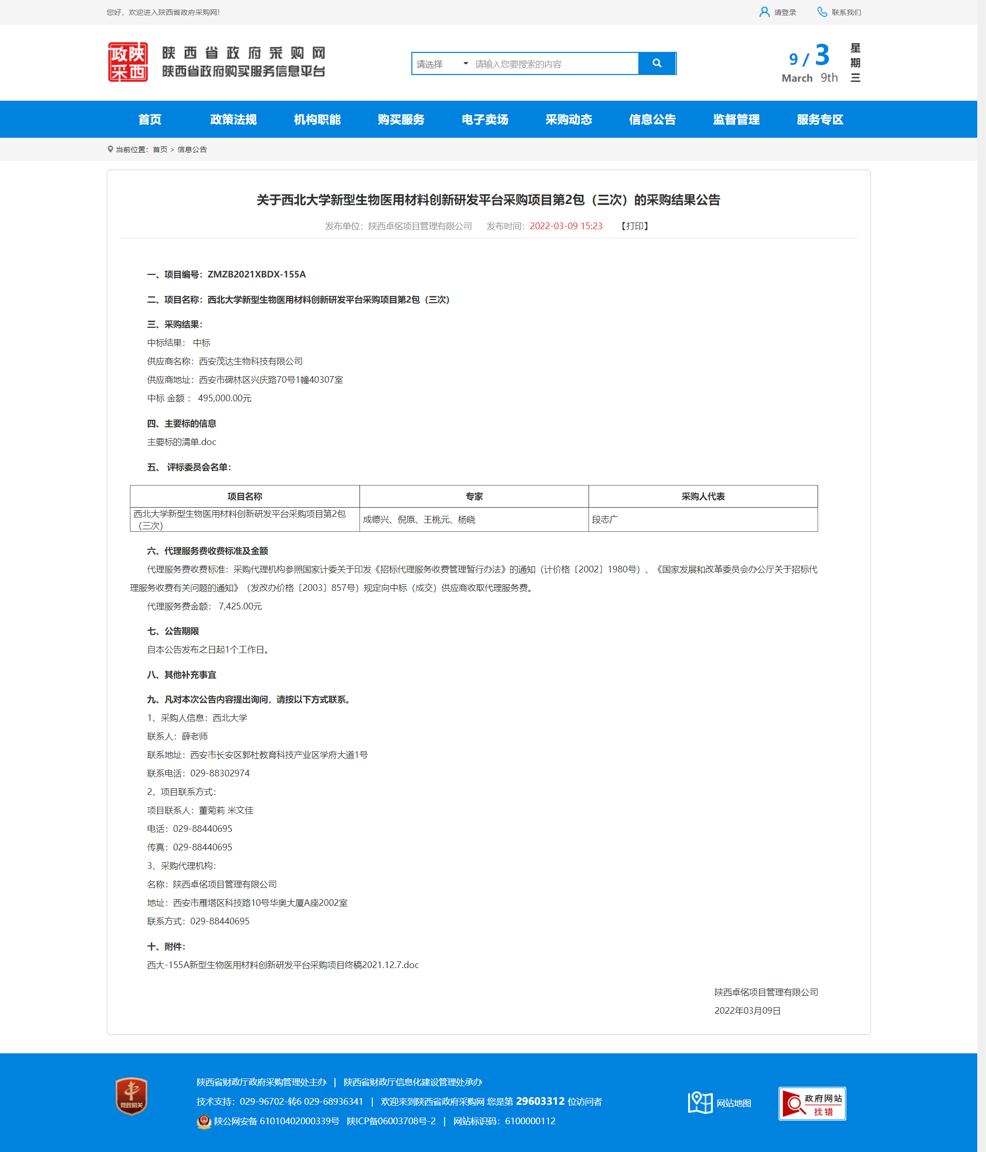 关于MILAN.COM新型生物医用材料创新研发平台采购项目第2包(三次)的采购结果公告 作者: 编辑:薛利娟 时间:2022-03-09 原公告链接:http://www.ccgp-shaanxi.gov.cn/notice/noticeDetail.do?noticeguid=8a85be317f3fe526017f6d6699050f58