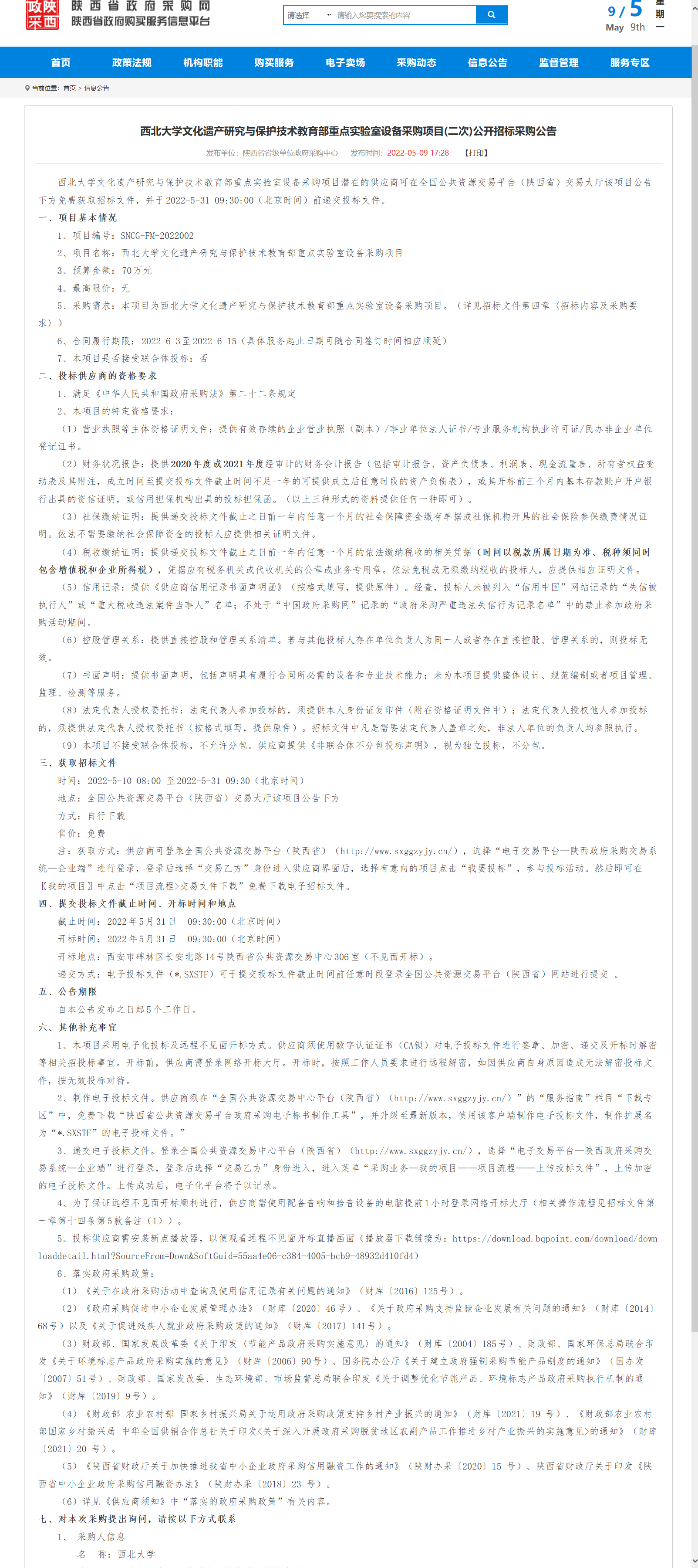 MILAN.COM文化遗产研究与保护技术教育部重点实验室设备采购项目(二次)公开招标采购公告 作者: 编辑:薛利娟 时间:2022-05-09 原公告链接:http://113.200.80.230/notice/noticeDetail.do?noticeguid=8a85be387f91f0bf0180a8225bed003f