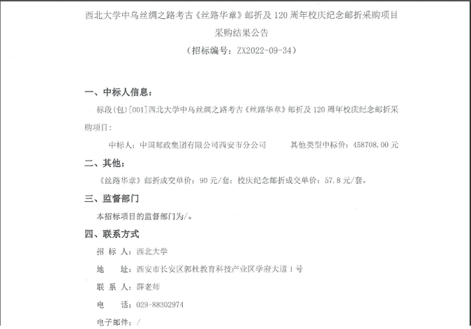 MILAN.COM中乌丝绸之路考古《丝路华章》邮折及120周年校庆纪念邮折采购项目采购结果公告 作者: 编辑:采购与招标办公室 时间:2022-10-09 原公告链接:http://bulletin.sntba.com/resultBulletin/2022-10-08/482720.html