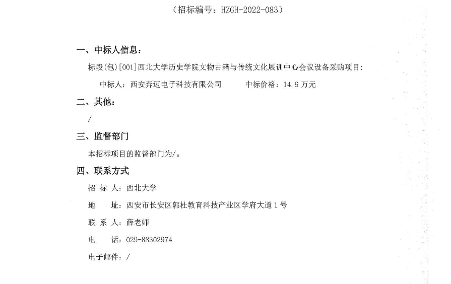 MILAN.COM历史学院文物古籍与传统文化展训中心会议设备采购项目中标结果公告 作者: 编辑:采购与招标办公室 时间:2022-10-21 原公告链接:http://bulletin.sntba.com/resultBulletin/2022-10-21/488897.html