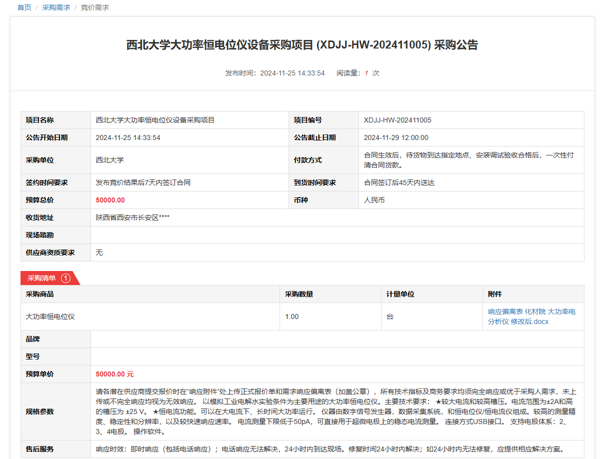 MILAN.COM大功率恒电位仪设备采购项目(XDJJ-HW-202411005)竞价采购公告 作者:采购与招标办公室 编辑: 时间:2024-11-25 原公告链接:https://www.ejingcai.com.cn/site/bidding/detail/15327