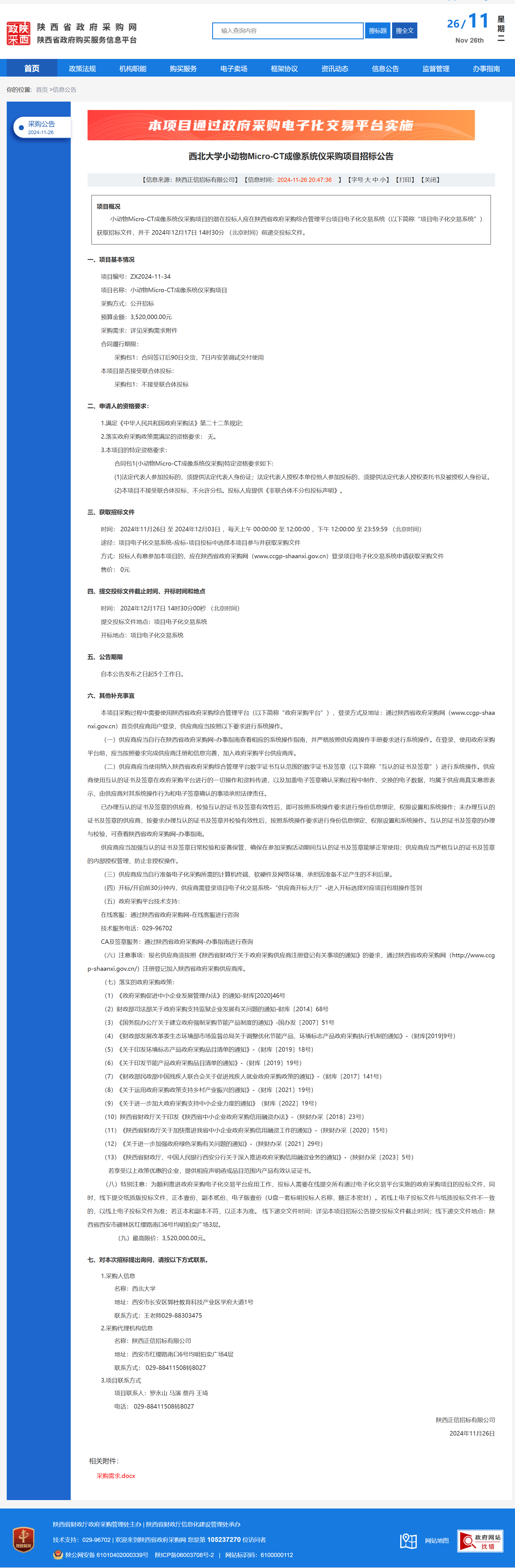 MILAN.COM小动物Micro-CT成像系统仪采购项目招标公告 作者:采购与招标办公室 编辑: 时间:2024-11-26 原公告链接:https://www.ccgp-shaanxi.gov.cn/freecms/site/shaanxi/ggxx/info/2024/8a69c251921857370193685963892947.html?noticeType=001011¬iceId=3436110f-abf6-11ef-8063-08c0eb20c666