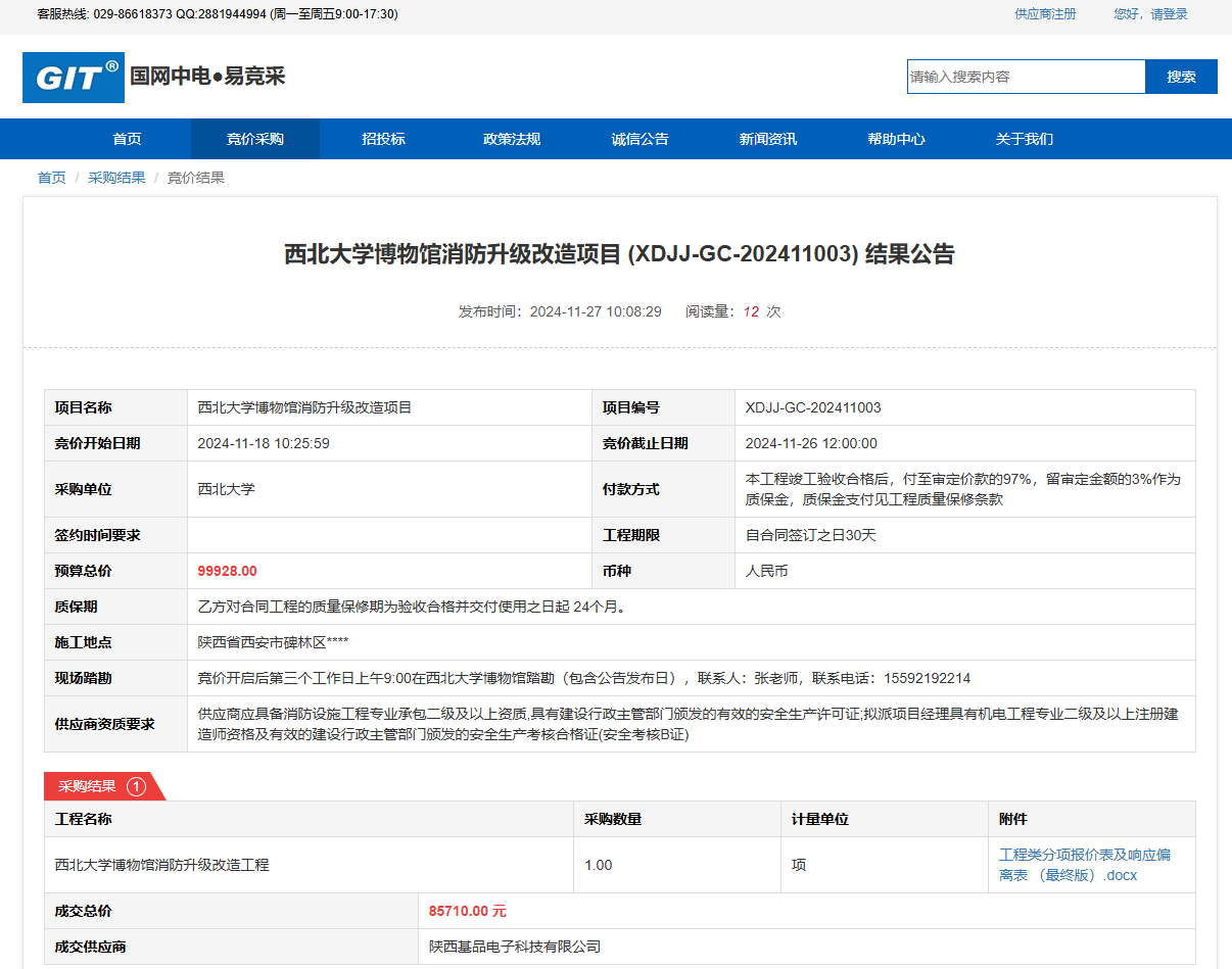 MILAN.COM博物馆消防升级改造项目(XDJJ-GC-202411003)竞价结果公告 作者:采购与招标办公室 编辑: 时间:2024-11-27 原公告链接:https://www.ejingcai.com.cn/site/bidding/detail/15427
