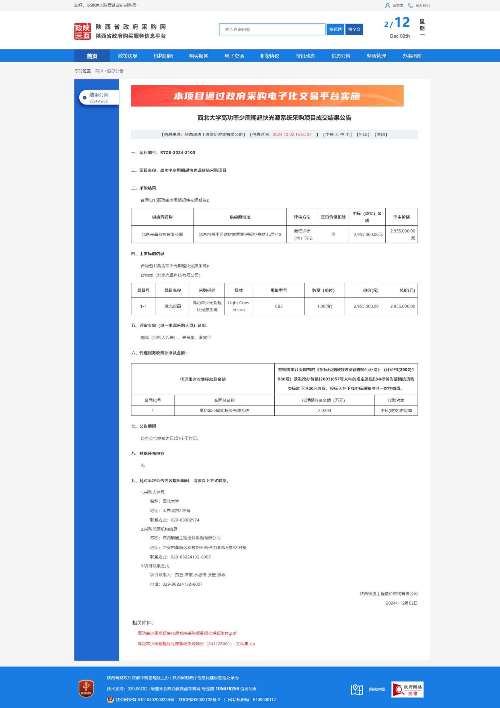 MILAN.COM高功率少周期超快光源系统采购项目成交结果公告 作者: 编辑:薛利娟 时间:2024-12-02 原公告链接:https://www.ccgp-shaanxi.gov.cn/freecms/site/shaanxi/ggxx/info/2024/8a69c2519218573701938649d42c03eb.html?noticeType=001025¬iceId=b85354c1-b083-11ef-8063-08c0eb20c666