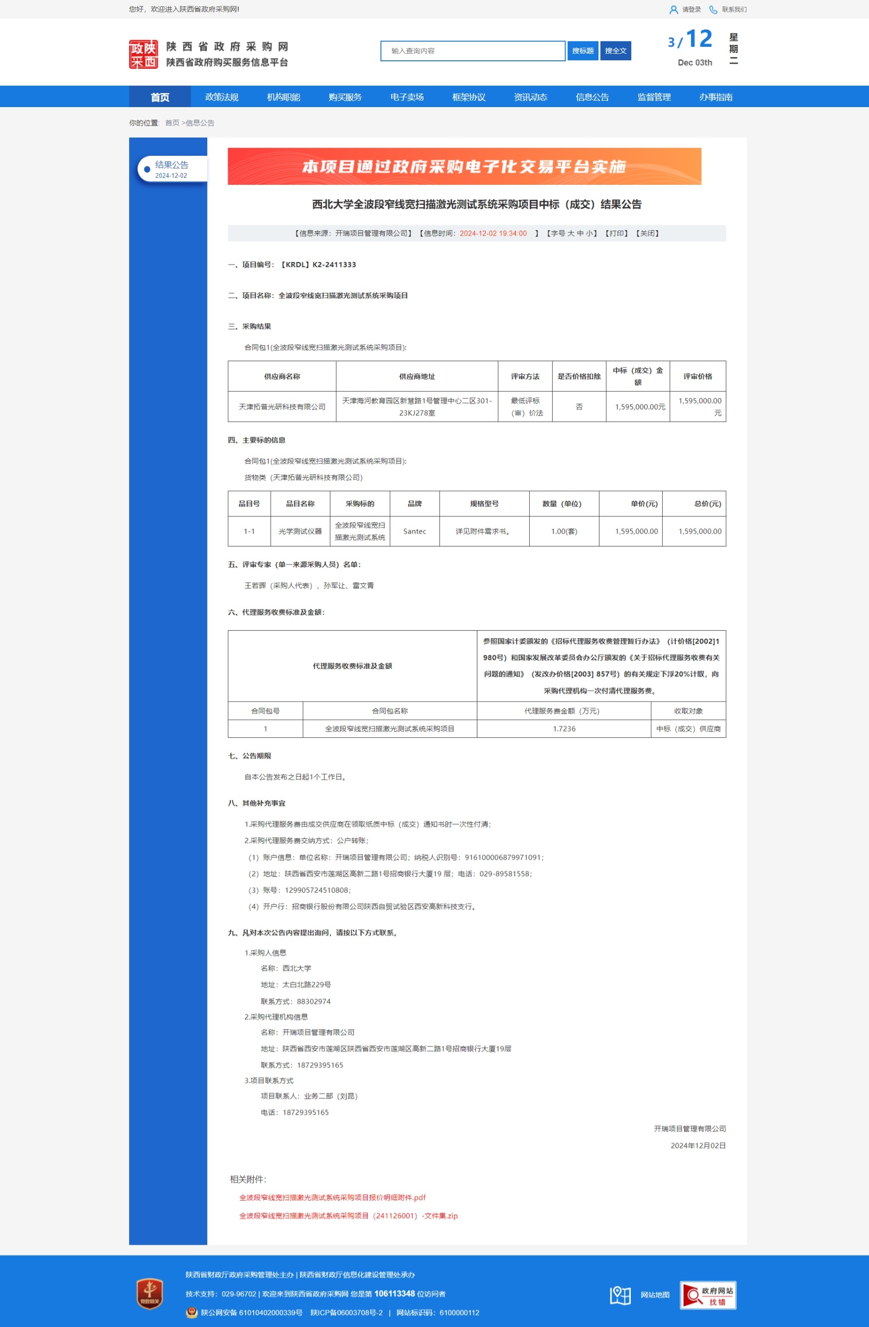 MILAN.COM全波段窄线宽扫描激光测试系统采购项目中标(成交)结果公告 作者: 编辑:薛利娟 时间:2024-12-03 原公告链接:https://www.ccgp-shaanxi.gov.cn/freecms/site/shaanxi/ggxx/info/2024/8a69c25192185737019387129cff6e5b.html?noticeType=001025¬iceId=ed669128-b0a2-11ef-8063-08c0eb20c666