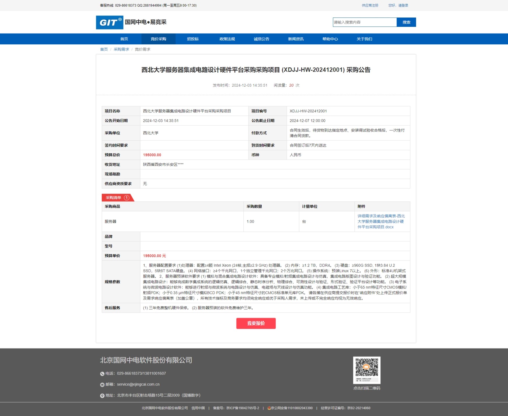 MILAN.COM服务器集成电路设计硬件平台采购采购项目 (XDJJ-HW-202412001) 竞价采购公告 作者: 编辑:薛利娟 时间:2024-12-03 原公告链接:https://www.ejingcai.com.cn/site/bidding/detail/15610