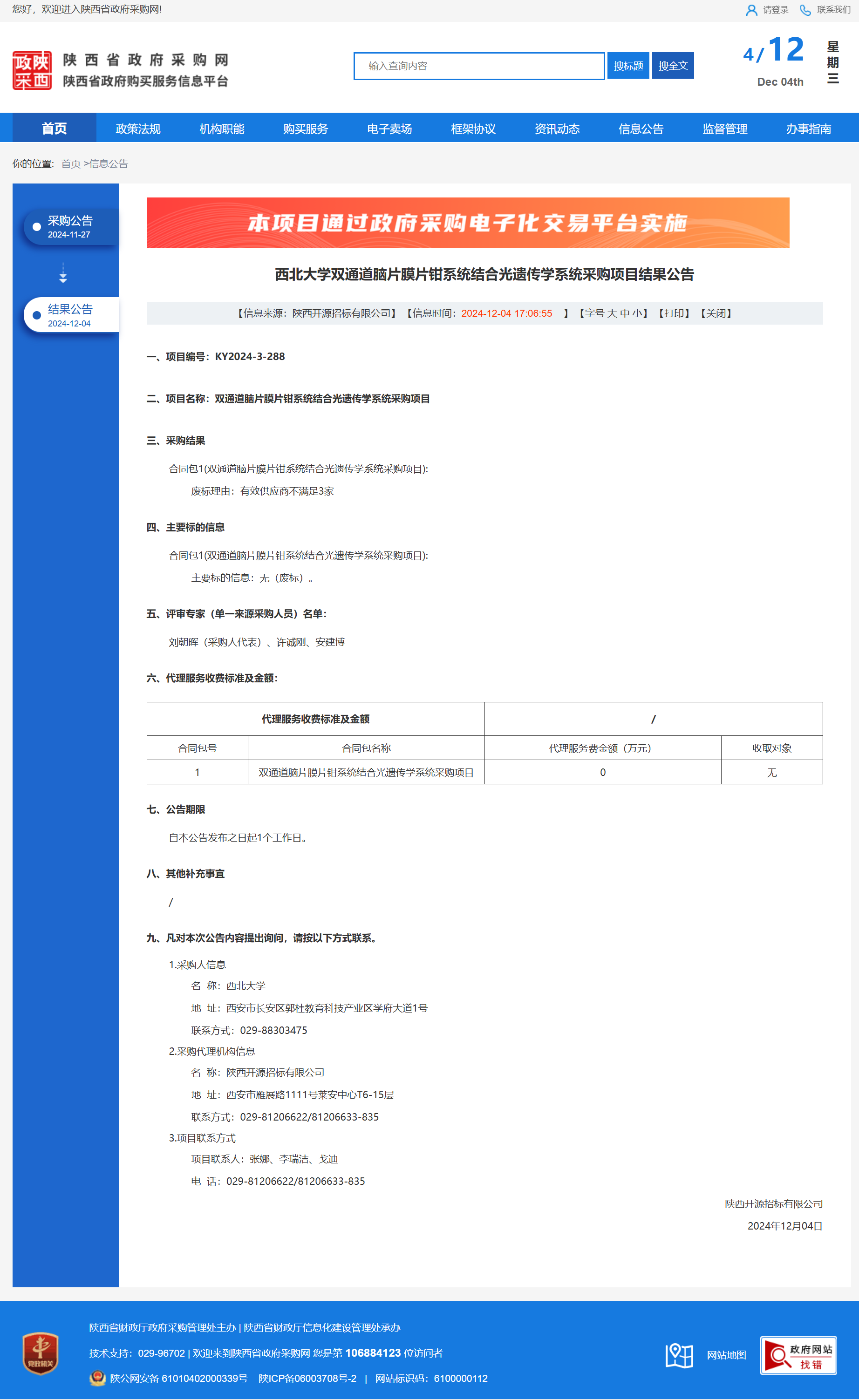 MILAN.COM双通道脑片膜片钳系统结合光遗传学系统采购项目结果公告 作者:采购与招标办公室 编辑: 时间:2024-12-04 原公告链接:https://www.ccgp-shaanxi.gov.cn/freecms/site/shaanxi/ggxx/info/2024/8a69c95d921859f0019390e7940533eb.html?noticeType=001006¬iceId=b68a3b19-b220-11ef-8063-08c0eb20c666