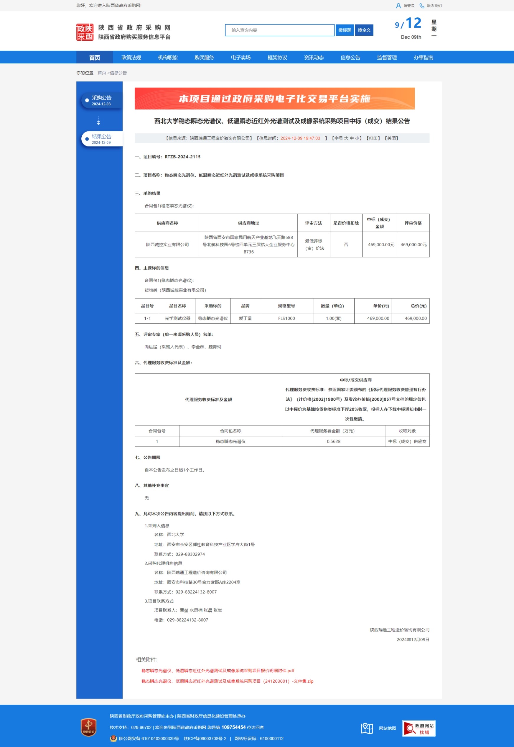 MILAN.COM稳态瞬态光谱仪、低温瞬态近红外光谱测试及成像系统采购项目1包中标(成交)结果公告 作者: 编辑:薛利娟 时间:2024-12-09 原公告链接:https://www.ccgp-shaanxi.gov.cn/freecms/site/shaanxi/ggxx/info/2024/8a69c5a59218576d0193ab3a463c038f.html?noticeType=001023¬iceId=ec36bd41-b624-11ef-8063-08c0eb20c666